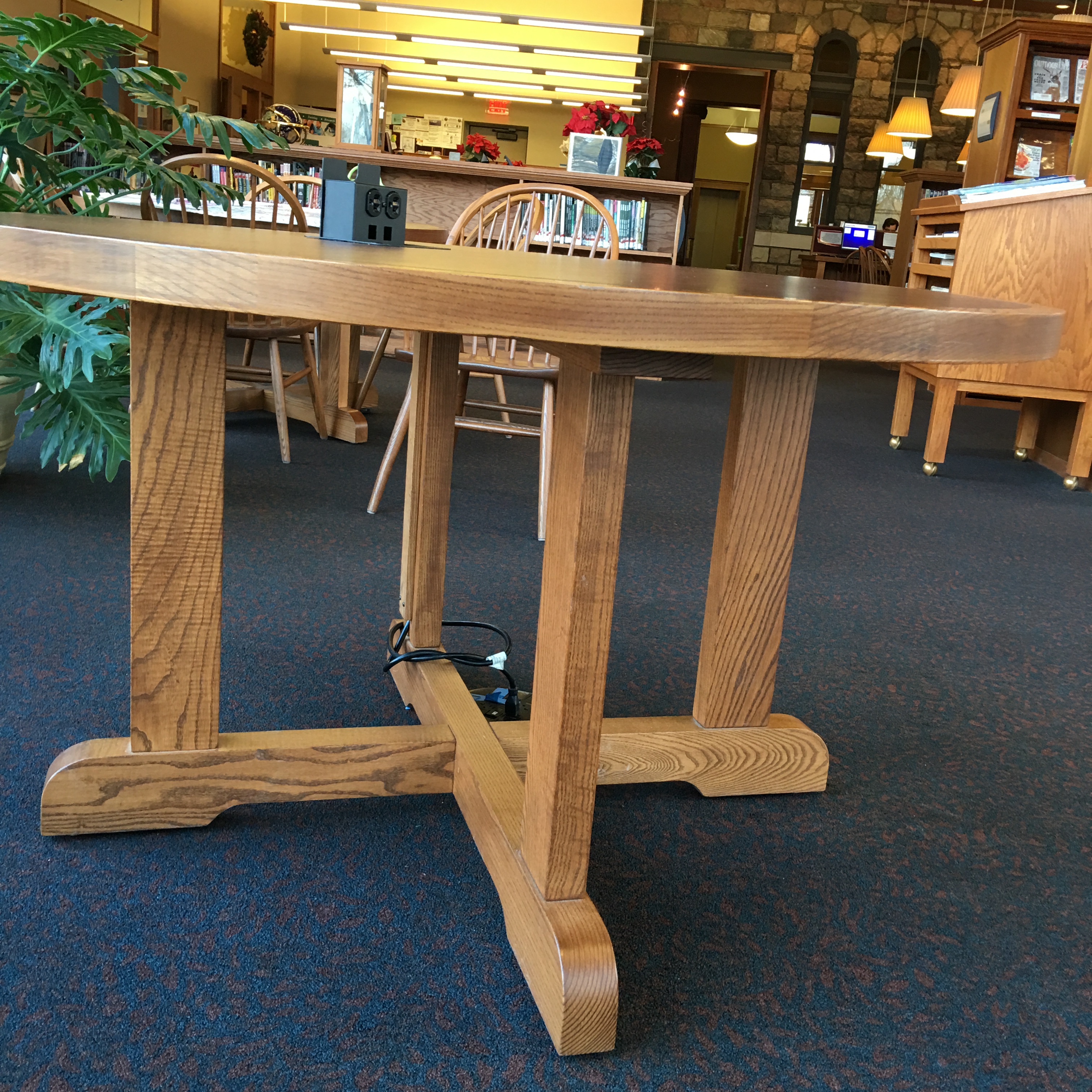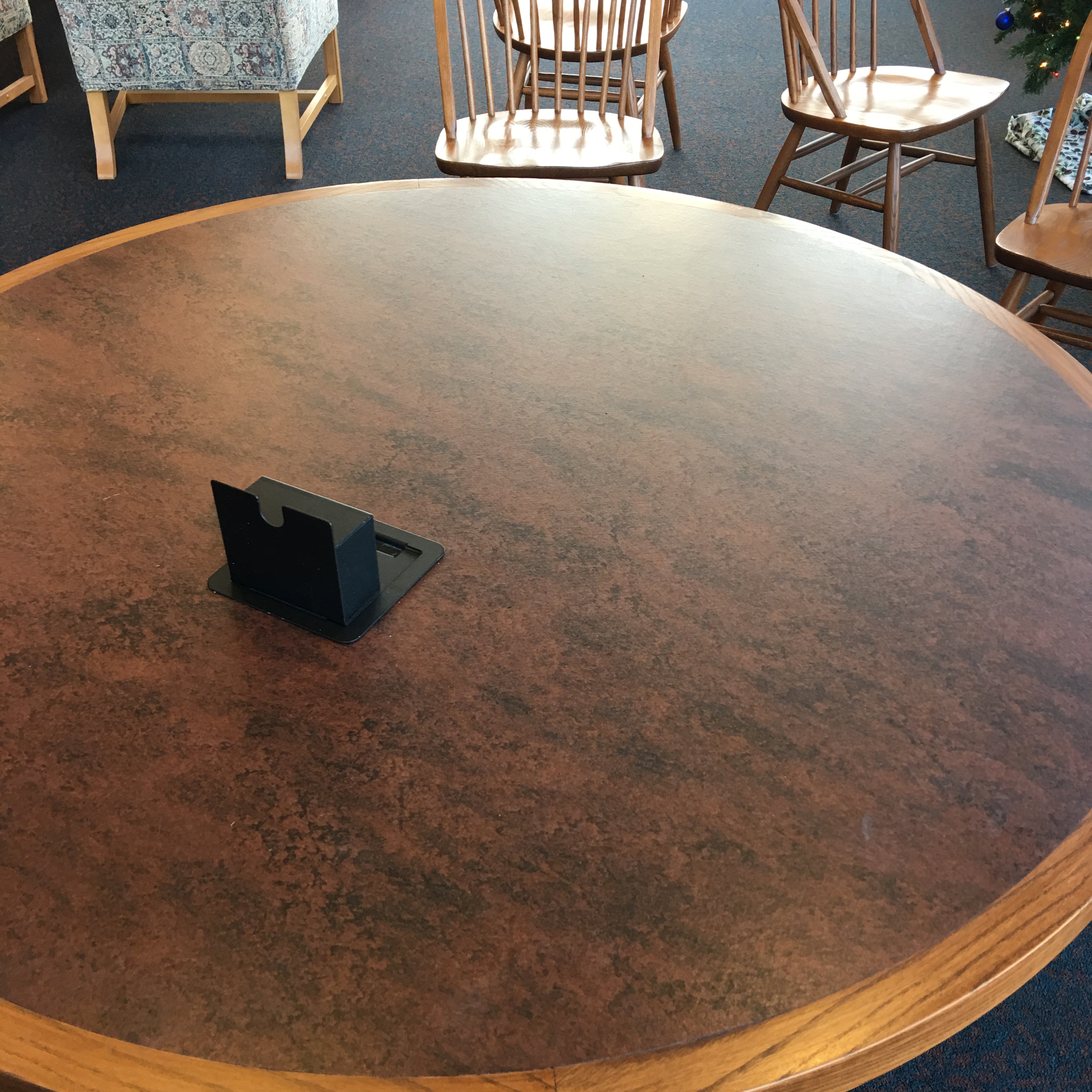 We are selling a beautiful round wooden table with an electric plug in it. $100.00 -- Kristina Reynolds Youth Librarian Portland District Library 334 Kent St Portland, MI 48875
