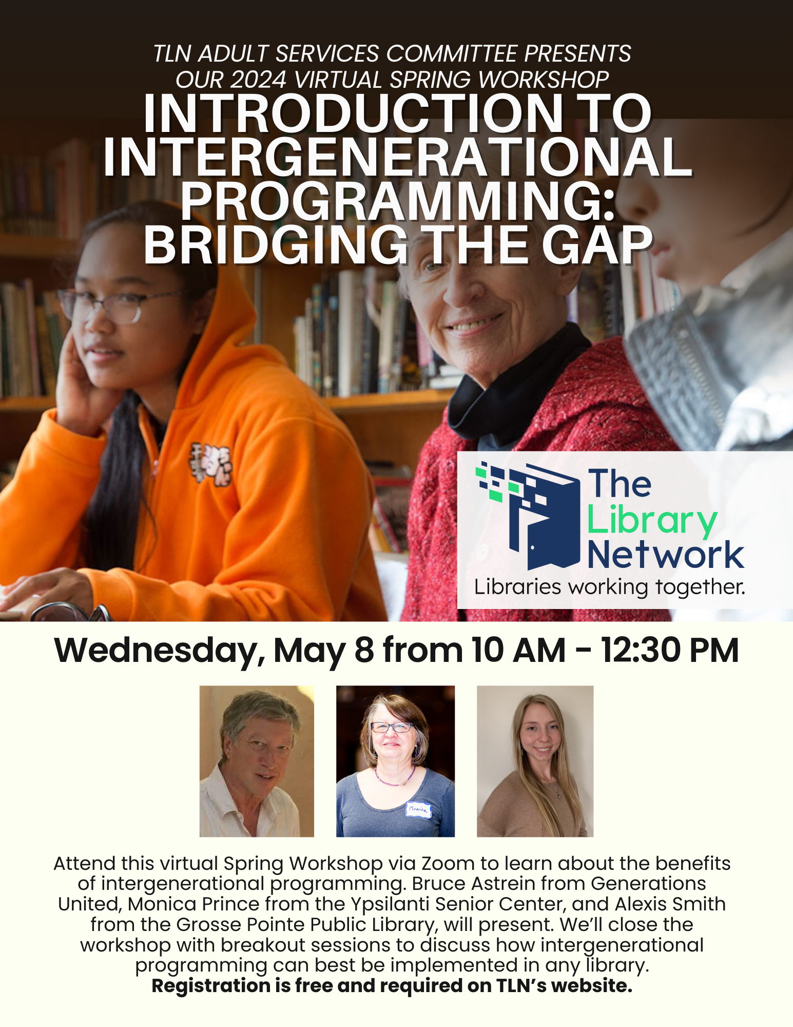 Hey Michlib-L, [ https://tln.org/events/EventDetails.aspx?id=1821868&group= | Registration is open ] ! Join us for the Adult Services Committee's 2024 Virtual Spring Workshop. Following the theme of Intergenerational Programming, join us for special presentations, breakout sessions, and conversations around how to make programs that appeal across generational divides. The event is free and registration is open now! Join us for an amazing morning of learning! [ https://tln.org/events/EventDetails.aspx?id=1821868&group= ] DJ Bond Member Engagement Coordinator The Library Network (248) 536-3100 x116 dbond@tln.org TLN.org (he/him)