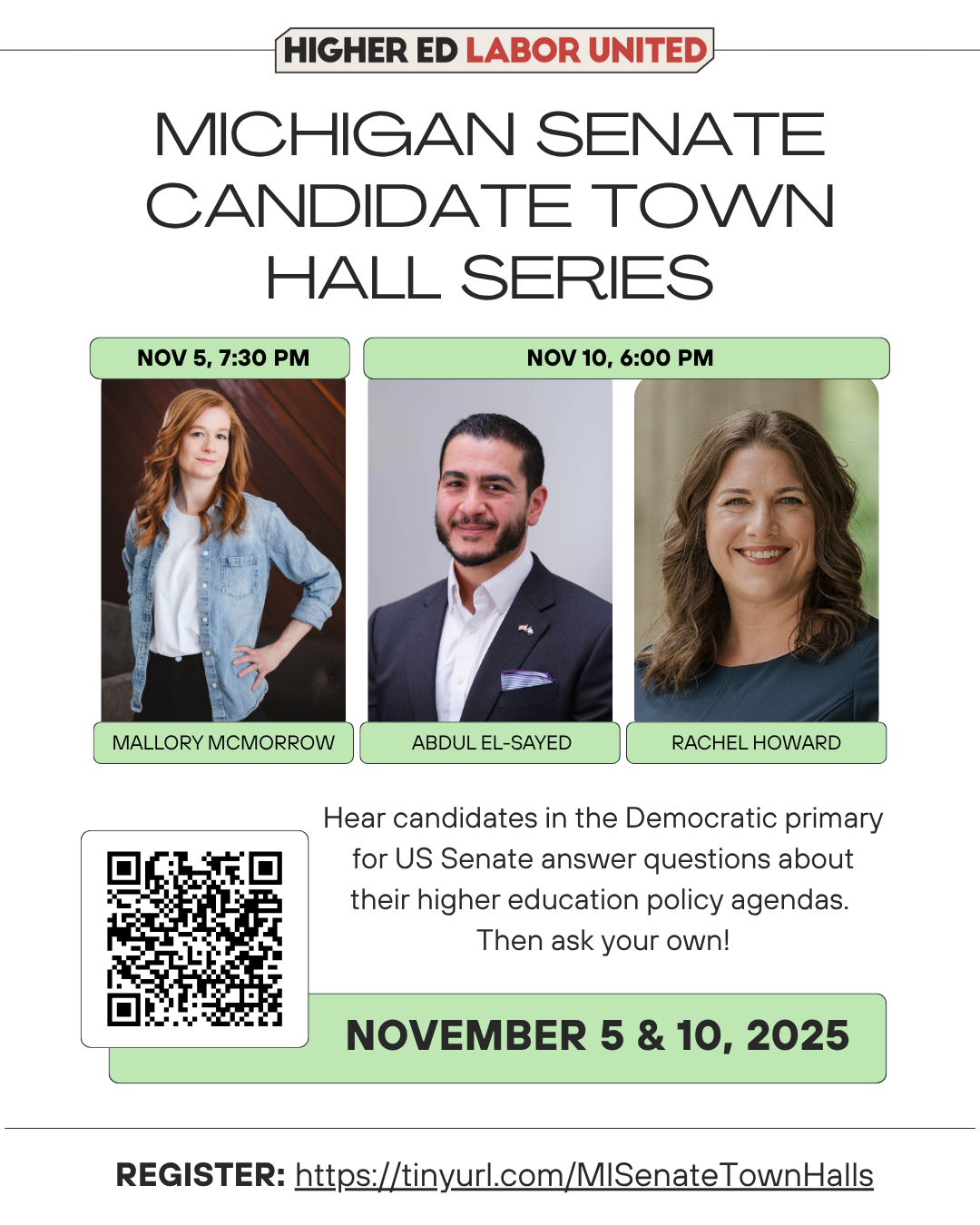 Hi hi fellow library workers! Though this may be specific to those of us who work in higher ed, I suspect there's lots of folks who may be interested on this list. There are two upcoming MI Senate Candidate Town Halls dedicated to their higher ed policy agendas. See flier below and more info here <https://higheredlaborunited.org/2025/10/20/november-5-10-michigan-senate-candidate-town-hall-series/> . [image: MI-Senate-Town-Hall-HELU-Nov-2025-101625.png] -- Meghan McGowan she | they -- Meghan McGowan she | they