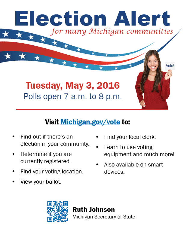 Hello. Next Tuesday, May 3, many local communities across Michigan will be having elections, so we are once again asking all libraries to post the attached flyer and share the following message via your communication channels. On Monday, May 2, we will send you a social media message that we hope you will also share. As always, thank you for your help! Election Alert Many Michigan communities to host elections May 3 Secretary of State Ruth Johnson is encouraging all eligible voters in communities hosting elections to cast their ballots on Tuesday, May 3. To determine if your community has an election or to view a sample ballot, visit the Michigan Voter Information Center at www.michigan.gov/vote<http://www.michigan.gov/vote>. The polls are open on Election Day from 7 a.m. to 8 p.m. Cathleen Simlar Cathleen P. Simlar Communications Specialist, Executive Office Michigan Department of State Office: (517) 373-9080 Cell: (248) 761-7145 Email: Simlarc@michigan.gov<mailto:Simlarc@michigan.gov> Join My Professional network on LinkedIn<blocked::http://www.linkedin.com/pub/cathleen-simlar/18/798/235> [Description: Description: Description: SOS logo small] <http://www.michigan.gov/sos> STAY CONNECTED: [Description: Description: Description: Facebook logo]<http://www.facebook.com/MichiganSoS> [Description: Description: Description: Twitter logo] <https://twitter.com/michsos> [Description: Description: Description: YouTube logo] <http://www.youtube.com/michsosoffice> [Description: Description: Description: GovDelivery logo] <https://public.govdelivery.com/accounts/MISOS/subscriber/new>