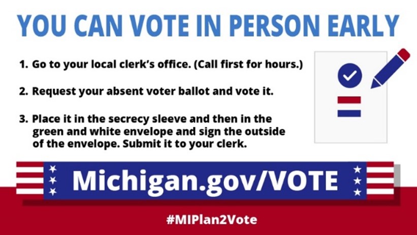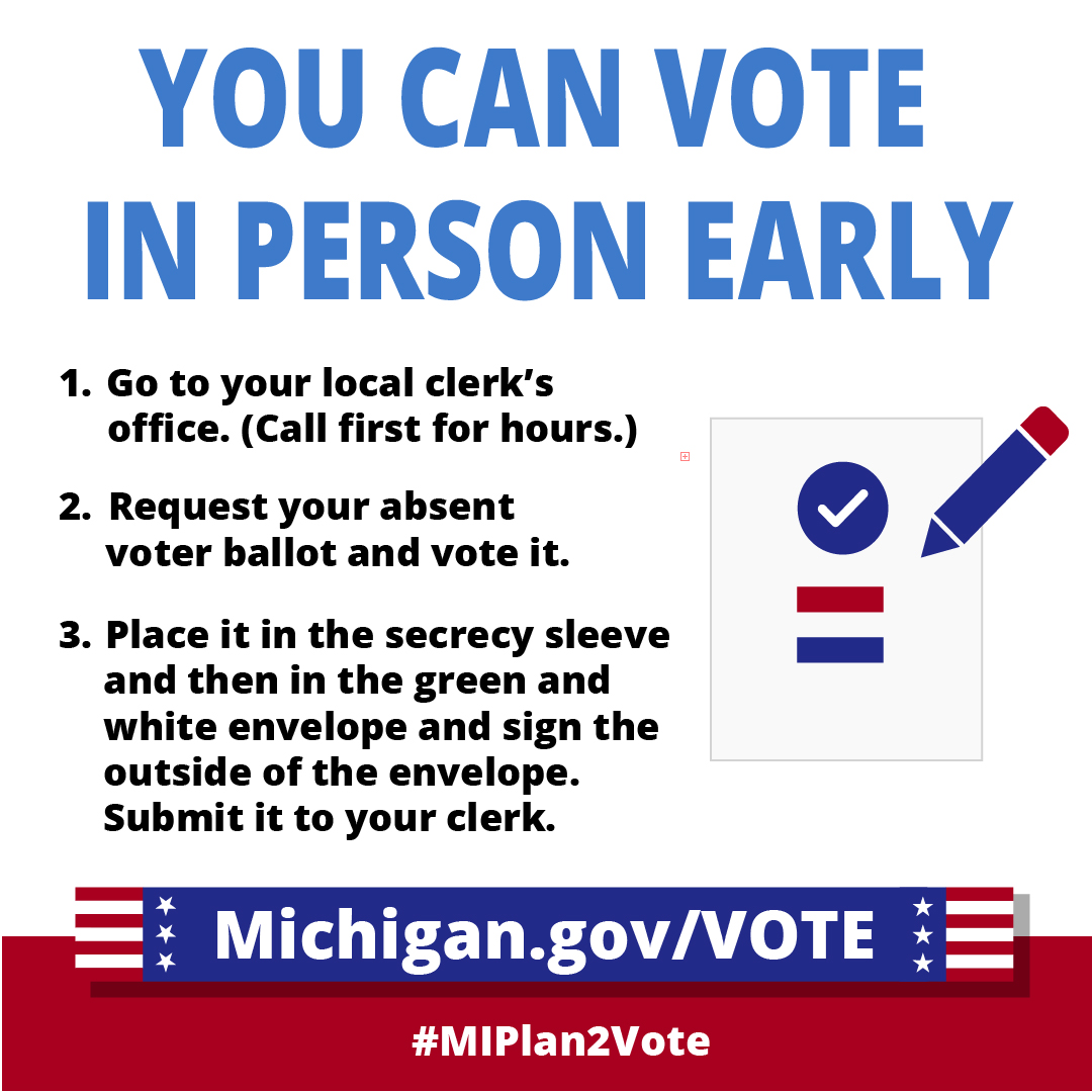 Hello. Attached is an early voting image created in two different sizes for social media that we hope you will share along with the accompanying text provided below. I plan to send a few more images later this week. As always, thank you for your help. Did you know you can vote early at your clerk's office? Find their hours and location at Michigan.gov/Vote. #MIPlan2Vote Cathleen P. Simlar Communications Specialist Michigan Department of State Office: (517) 335-3263 Cell: (248) 761-7145 Email: SimlarC@Michigan.gov<mailto:SimlarC@Michigan.gov> Join My Professional network on LinkedIn<blocked::http://www.linkedin.com/pub/cathleen-simlar/18/798/235> [cid:image001.png@01D6AB75.5B84C700]