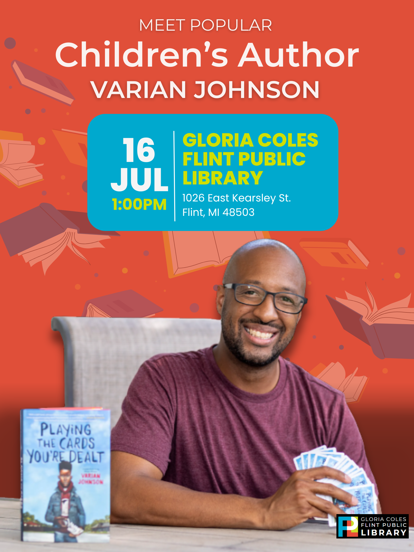 Hi Friends! We’ve got something special coming up at the Gloria Coles Flint Public Library, and we’d love for you to join us! Author Varian Johnson — writer of The Parker Inheritance, Twins, and more — is stopping by to chat about his books, his writing journey, and what inspires his stories. When: Wednesday, July 16, 2025 Time: 1:00 PM Where: Gloria Coles Flint Public Library 1026 E. Kearsley Street, Flint, MI It’s a perfect event for readers of all ages, especially fans of middle grade and young adult books. Bring your questions and your favorite Varian Johnson book — there will be time for Q&A and book signing! 🎉 Free and open to everyone — no RSVP needed! Just come by and enjoy. If you have any questions, please feel free to reach out! Hope to see you there! — Your friends at the Gloria Coles Flint Public Library Leah Feimster Communications & Community Engagement Coordinator (810) 249-2044 lfeimster@fpl.info [1750800001430]