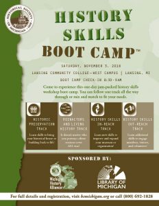 There are only 10 days left to register! Join us November 3 for our full day of workshops geared toward historical training, skill-building, and more! Take part in our new one-day jam-packed history skills "Boot Camp"! Attend a full day of workshops to hone your skills in the areas of reenacting, historic restoration, improving and expanding your organization, engaging new visitors and volunteers, and more! This event is open to ALL! We encourage individuals looking to learn a brand new skill or experienced historical organization professionals interesting in widening their knowledge to join us. Saturday, November 3, 2018 Lansing Community College-West Campus. <http://hsmichigan.org/conferences/boot-camp/boot-camp-registration/> Go to online registration for Boot Camp. <https://hsmichigan.org/wp-content/uploads/2018/09/Boot-Camp-brochure-online .pdf> Download the Boot Camp brochure here. The History Skills Boot CampT offers. . Four tracks that cover a range of popular topics. You can follow one track all the way through or mix and match to fit your needs. o Historic Preservation Track Learn skills to bring your historical house or building back to life! o <https://hsmichigan.org/wp-content/uploads/2018/09/Boot-Camp-brochure-online .pdf> Reenactors and Living History Track It doesn't matter who you portray-these sessions cover ALL eras! o History Skills In-Reach Track Learn new skills to improve and expand your museum or organization! o History Skills In-Reach Track Learn additional skills to engage members, visitors, and volunteers! . Luncheon Keynote o Network with new friends, enjoy a refreshing lunch, and listen to our luncheon keynote! o Keynote: Mythbusters-History Lies That Won't Die With Bob Myers, Historical Society of Michigan . Networking opportunities Come see what all the excitement is about! Registration deadline is October 29, 2018. _____ _____ The Historical Society of Michigan is our state's oldest cultural organization, founded in 1828 by territorial governor Lewis Cass and explorer Henry Schoolcraft. A nongovernmental nonprofit, the Society focuses on publications, conferences, education, awards and recognition programming, and support for local history organizations to preserve and promote Michigan's rich history. _____ For more information on the Historical Society of Michigan, please visit <http://www.hsmichigan.org/> www.hsmichigan.org or e-mail us at <mailto:hsm@hsmichigan.org> hsm@hsmichigan.org. _____ The Historical Society of Michigan 5815 Executive Dr. . Lansing, MI 48911 Phone: (517) 324-1828 . FAX: (517) 324-4370 Track 1: History Skills "In-Reach" Learn new skills to improve and expand your museum or organization Keeping It Organized: Museum Cataloguing 101 - Picturing the Past: Identifying and Preserving Historical Photographs Making the List: Nominating a Building to the State and/or National Registers We're Here to Help: Open Forum for Questions and Answers Track 2: History Skills "Out-Reach" Learn additional skills to engage members, visitors, and volunteers Start 'Em Early: Engaging Young Historians Getting Seen and Being Heard: Marketing for Small Historical Organizations Recording the Past: Oral History 201 Putting it in Print: Writing for Publication <http://hsmichigan.org/conferences/boot-camp/boot-camp-registration/> Go to online registration for Boot Camp. <https://hsmichigan.org/wp-content/uploads/2018/09/Boot-Camp-brochure-online .pdf> Download the Boot Camp brochure here. This e-mail is sent to our members and friends to keep you updated on historical activities and opportunities to learn more about our state's history. To opt-out, please respond to this e-mail with "remove" in the subject line. If you received this e-mail as part of your participation in the Michlib-l mailing list (listserv), please follow their removal process.