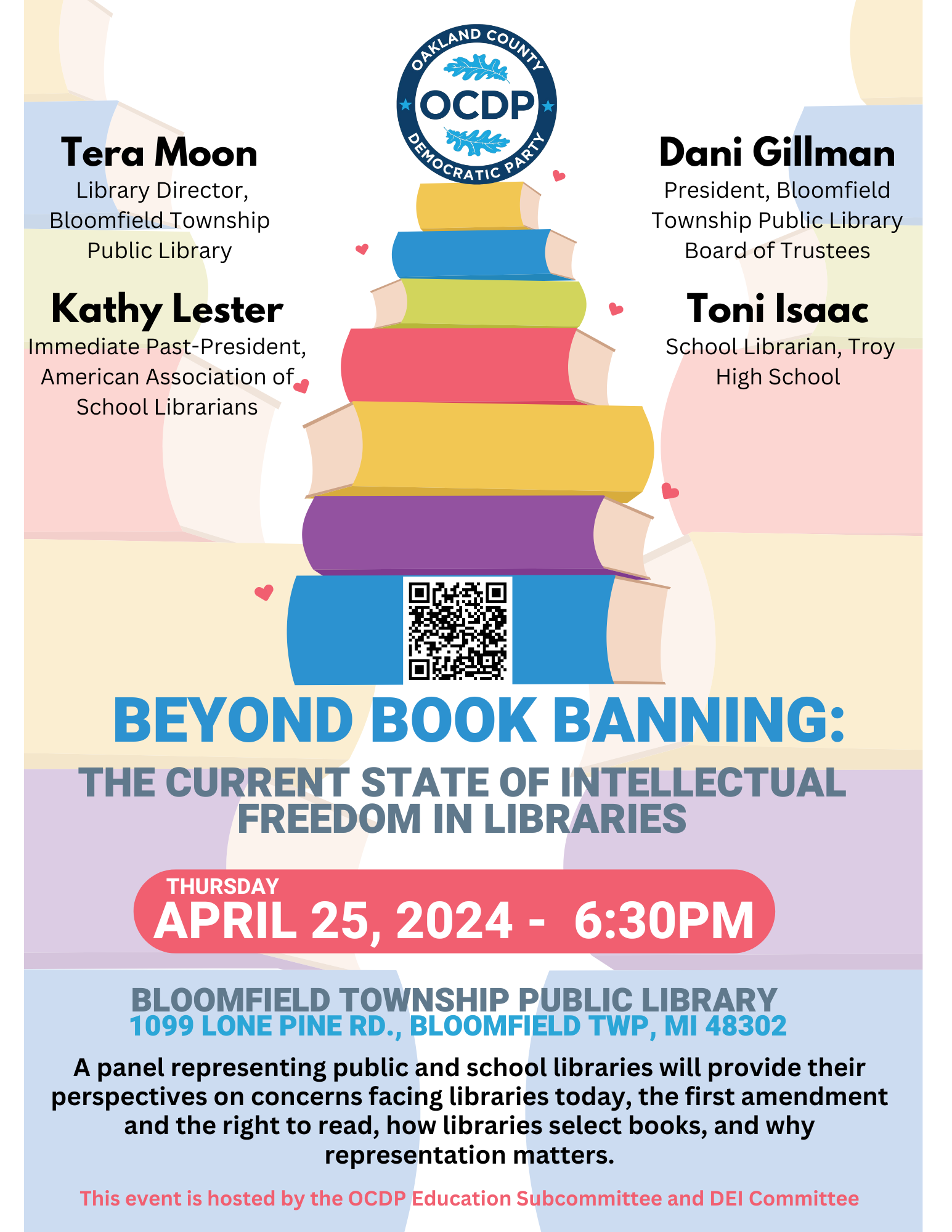 Hi All, Below is the information for two upcoming events. Please attend if you are able. --Kathy Tomorrow Evening 4/25 at 6:30pm EST Beyond Book Banning @ Bloomfield Township Library MASL members Toni Isaac & Kathy Lester are part of the panel Registration not required. [image: Book Banning Event.png] Sunday, 5/5 @ Detroit Public Library (Main Library) w/ Author Laura Pappano (Laura had interviewed me while I was AASL President for her book and asked if I would be willing to help her in conversation at this event.) [image: author series state of public schools.jpg] Kathy Lester, MLIS, MA Adjunct Faculty, *Wayne State University, School of Information Science* Advocacy Co-Chair, Past-President 2014*, **Michigan Association of School Librarians (MASL)* President, 2022-2023*, **American Association of School Librarians (AASL)* Councilor At Large*, American Library Association (ALA)* Retired School Library Media Specialist / Technology Coach*, **Plymouth-Canton Community Schools* *SL21 Model Library, 2017-2018* *SL21 Exemplary Ranking - Michigan School Libraries for the 21st Century 2013-2022* *ISTE Making IT Happen Award Winner* *2017 MAME Michigan School Library Program of the Year* *2012 **State Librarian's Excellence Award Winner* kathyL@mimasl.org twitter: @LibraryL <https://twitter.com/LibraryL> "Every school librarian is a leader; every learner has a school librarian" --American Association of School Librarians <http://www.ala.org/aasl/sites/ala.org.aasl/files/content/advocacy/tools/docs/AASL_Position_Statement_Effective_SLP_2018.pdf> (AASL)