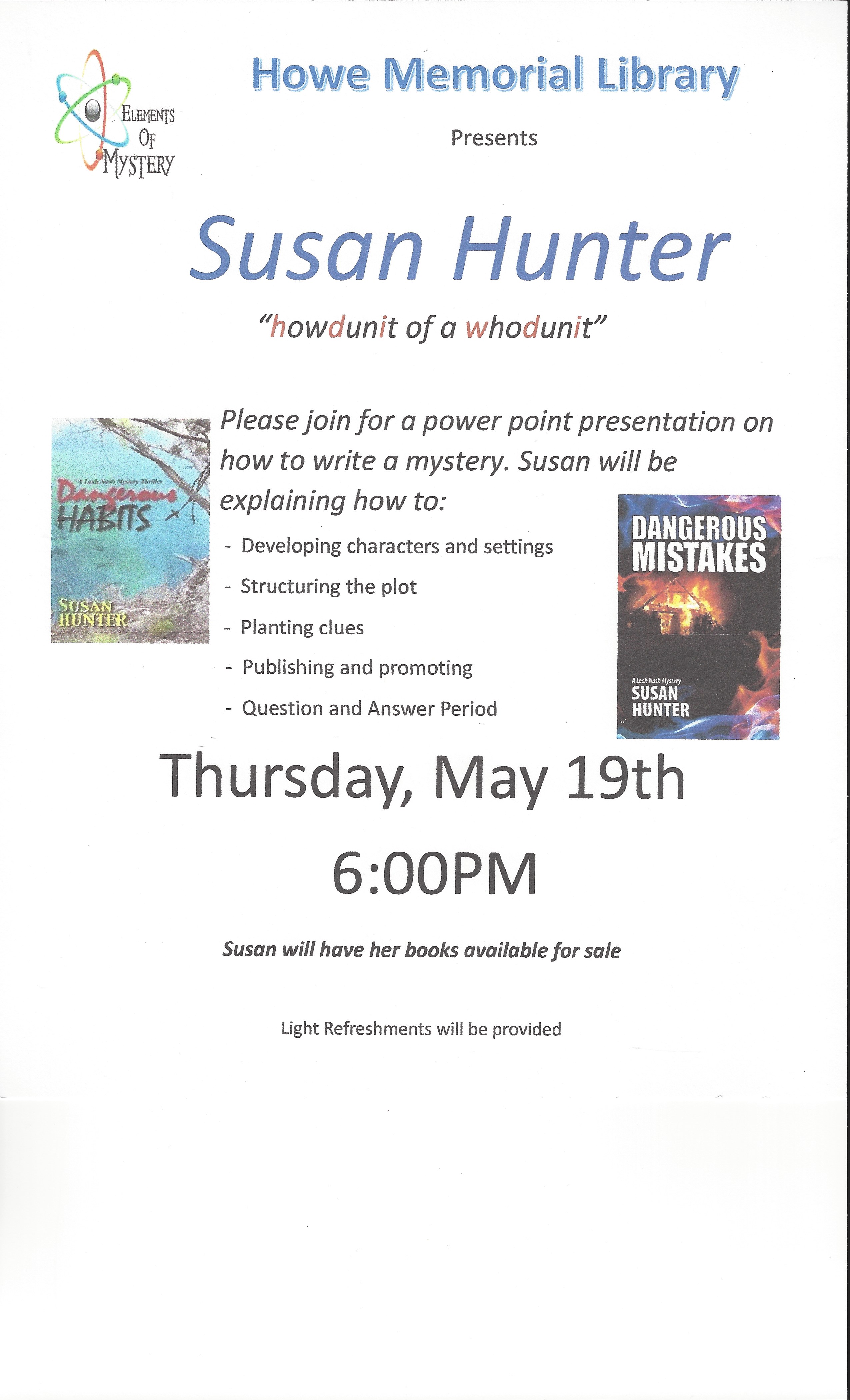 A recommend for a great program. We had Susan Hunter- Dangerous Mistakes and Dangerous Habits- here. She did a presentation on How to write a mystery. What a wonderful presentation and she is willing to go to other libraries. susanhunter607@gmail.com Sandy Johnson Howe Memorial Library 128 E. Saginaw St. Breckenridge, Mi. 48615 989-842-3202