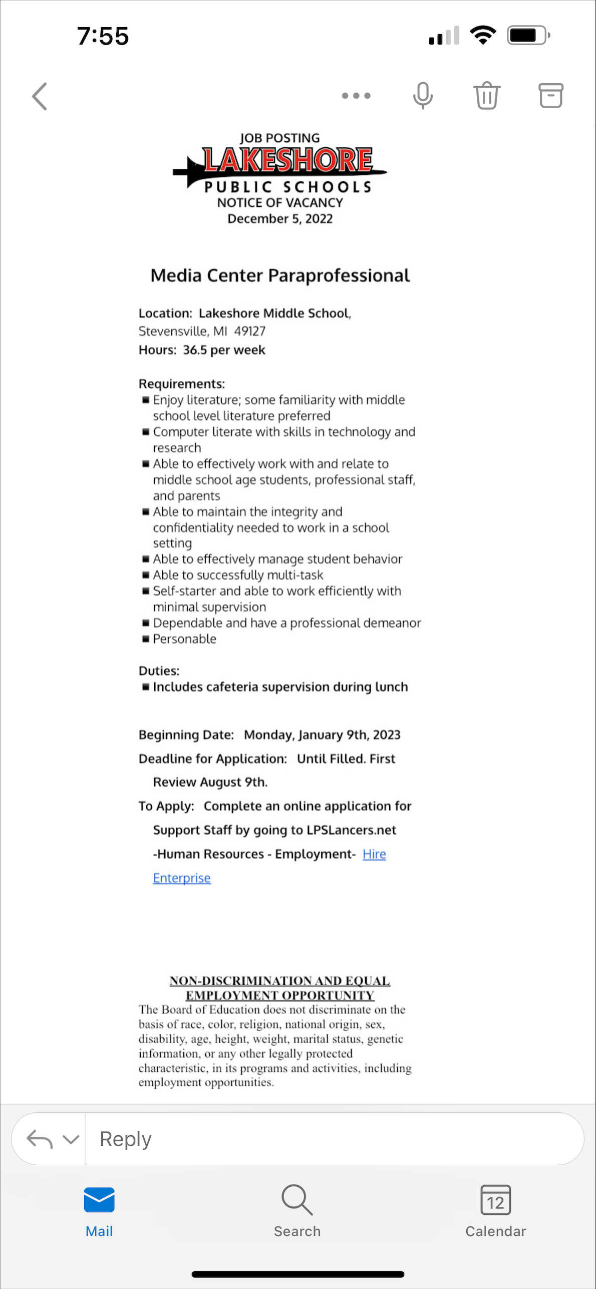 Lakeshore Middle School is looking for someone who loves kids and has a passion for books! Position: 36.5 hours/Media Center Paraprofessional position at Lakeshore Middle School in Stevensville, MI. For more information, please visit: https://www.lakeshoreschools.k12.mi.us/domain/37 Get Outlook for iOS<https://aka.ms/o0ukef>