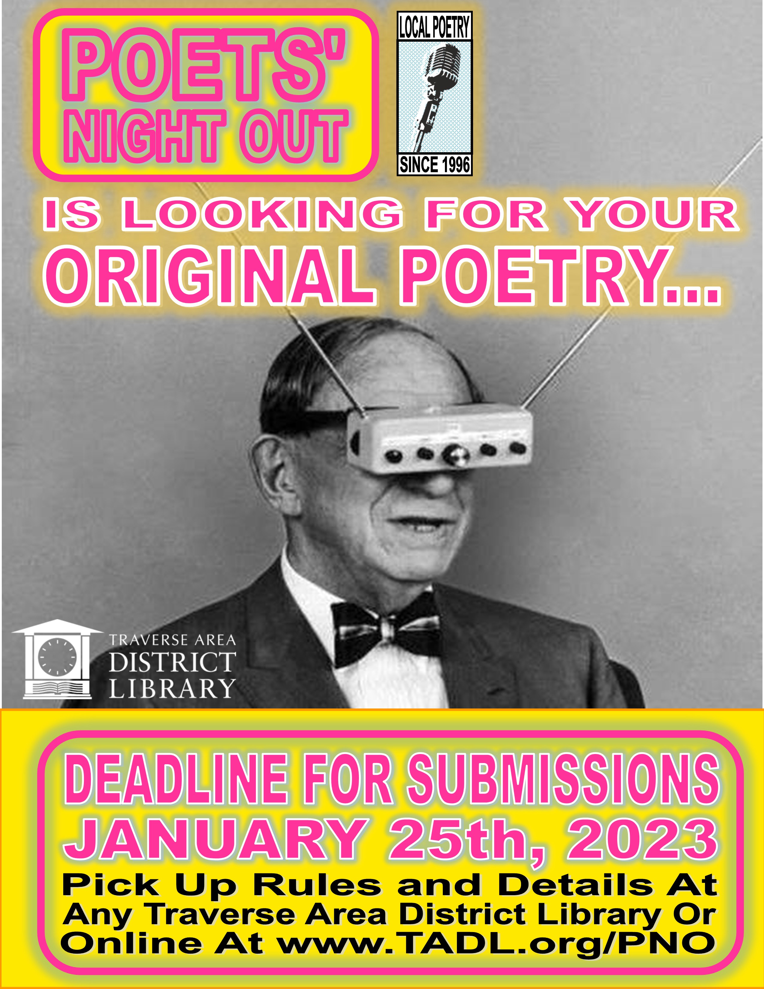 Good afternoon, We are looking for submissions for Poet's Night Out. I have attached a flyer with more details. Thank you, [image: PNO Call For Poetry 2023.jpg] -- Kelly Haug *she/her/hers* Library Assistant 1, Adult Services Traverse Area District Library *What I am currently reading:* *The Final Girls Support Group *by Grady Hendrix