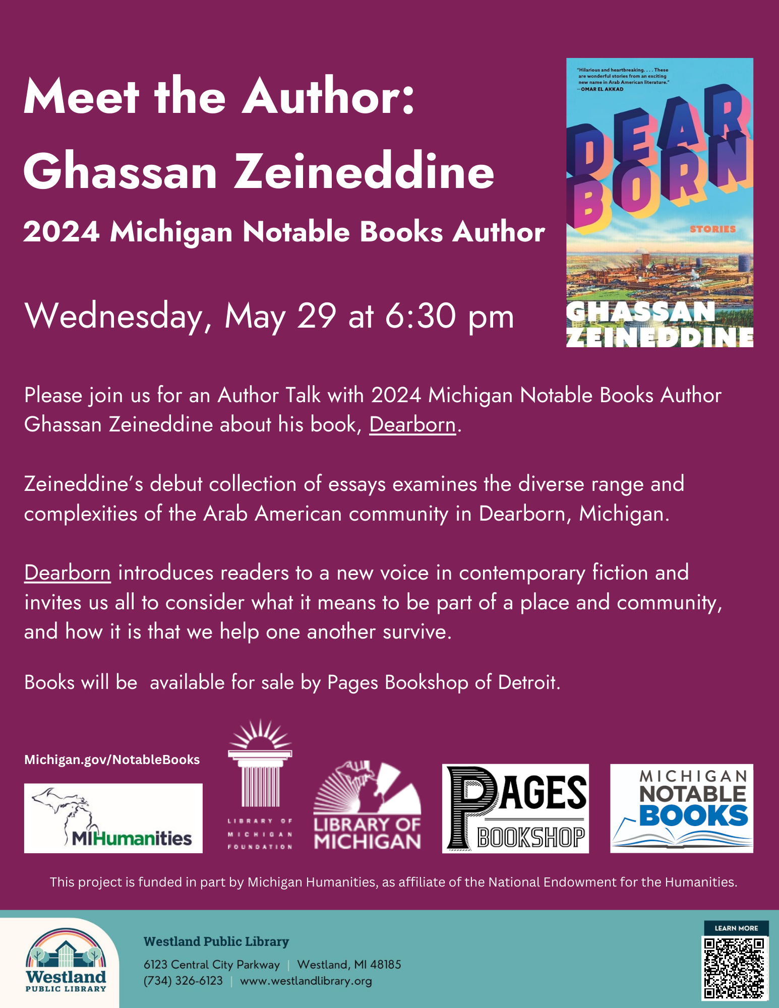 Everyone - Michigan Notable Book Author Ghassan Zeineddine will be visiting the Westland and Dearborn Libraries on May 29th and 30th as part of the Notable Book Author Tour to talk about his book entitled Dearborn. We hope you can take advantage of this great opportunity! Mr. Zeineddine will be at the Westland Library on Wednesday, May 29th at 6:30pm. Please visit the Events Calendar at the Westland Library Website www.westlandlibrary.org <http://www.dearbornlibrary.org/> to register for this program. If you have any questions regarding this event, then please contact Marissa Lasoff-Santos at marissa.ls@westlandlibrary.org. Mr. Zeineddine will be joined in conversation here at the Dearborn Library on Thursday, May 30th by fellow Michigan Notable Book Author RS Deeren; both authors will share stories and insights on the writing process of their acclaimed books. Please visit our Library's Events Calendar at our website www.dearbornlibrary.org to register for this program. If you have any questions regarding this event, then please contact Dan Lodge at dlodge@dearborn.gov. We hope you can take advantage of either opportunity! Dan Lodge Librarian I Adult Services Dearborn Public Library Dearborn, MI