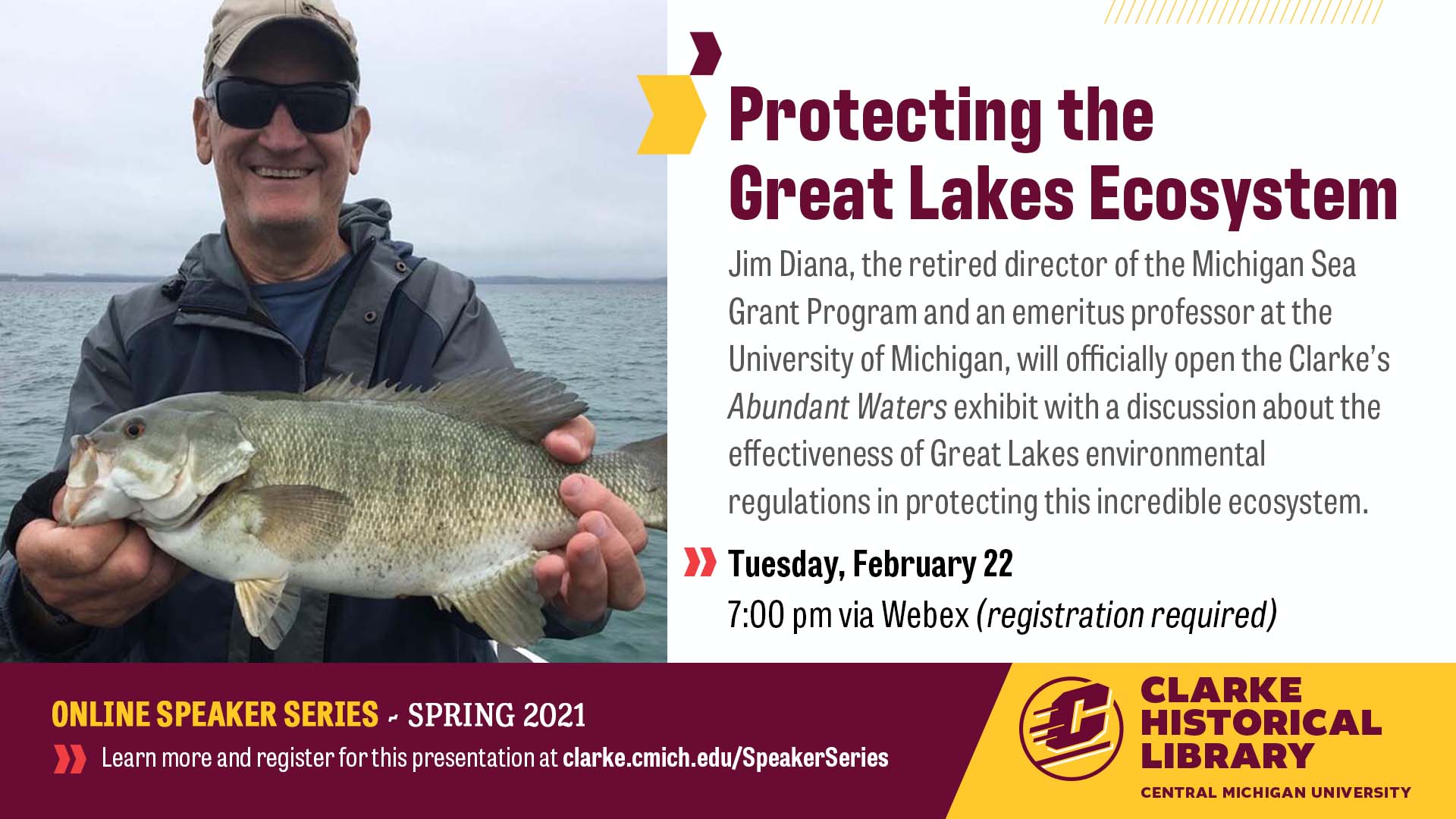 On Tuesday, February 22, at 7:00 pm EST, the Clarke Historical Library at Central Michigan University will host the first presentation of our spring semester Speaker Series (you can find the entire line-up on the Clarke's website<https://www.cmich.edu/research/clarke-historical-library/events-exhibits-and-news/speaker-series-presentations>). Jim Diana, retired director of the Michigan Sea Grant Program and an emeritus professor at the University of Michigan, will officially open the Clarke's Abundant Waters exhibit<https://www.cmich.edu/research/clarke-historical-library/events-exhibits-and-news/exhibitions> with a discussion about the effectiveness of Great Lakes environmental regulations in protecting this incredible ecosystem. This presentation is free and open to the public. The event will be broadcast via Central Michigan University's videoconferencing tool, Webex, and it will be recorded to enjoy at a later time. Registration is required for the event and the shortened link to register is: https://tinyurl.com/ClarkeGreatLakes. Please share this information with anyone who you think might be interested. The Clarke is happy to answer any questions that anyone may have-please contact Bryan Whitledge (whitl1br@cmich.edu<mailto:whitl1br@cmich.edu>). Have a great day, Bryan Whitledge Archivist for University Digital Records Clarke Historical Library Central Michigan University 989-774-2159 whitl1br@cmich.edu<mailto:whitl1br@cmich.edu>