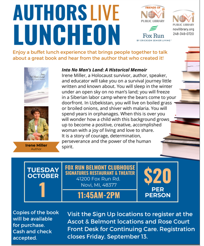 Hello Library Land! I want to recommend a wonderful author and speaker that presented to the Novi community: Irene Miller. Below is the flyer that NPL used to promote Irene's event. Irene was an amazing speaker and gave us one hour of her time, along with Q&A sharing her incredible story. You and your communities will not be disappointed. We heard rave reviews and many thanks by our attendees.