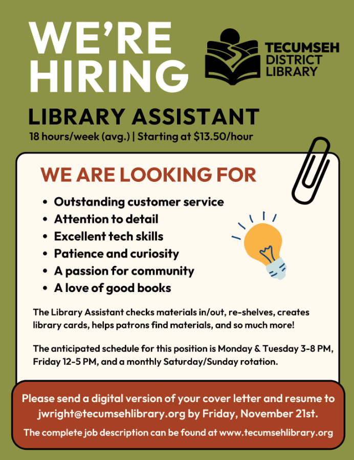 Good afternoon! Tecumseh District Library is accepting applications for a part-time Library Assistant. You can find more information in the attached flyer or on our website <https://tecumsehlibrary.org/employment/>. Applications are due to jwright@tecumsehlibrary.org by Friday, November 21st. jordan [image: image.png] -- Jordan Wright Library Director Tecumseh District Library 215 N Ottawa St, Tecumseh, MI 49286 jwright@tecumsehlibrary.org | 517-423-2238 x. 11 www.tecumsehlibrary.org