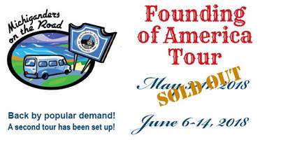 Our "Founding of America Tour" was so popular that it filled up months before the deadline, so we are repeating the tour June 6-14, 2018! If you missed getting on the May tour, you still have a chance to join the Historical Society of Michigan's "Michiganders on the Road" for a 9-day, 8-night tour of Washington, D.C., Colonial Williamsburg, Monticello, Montpelier, the Gettysburg Battlefield, and much more. Sign up before this tour fills! <https://hsmichigan.org/wp-content/uploads/2017/10/founding-of-america-tour. pdf> See the detailed itinerary <http://hsmichigan.org/programs/michiganders-on-the-road/america-tour-regist ration/> Register today <https://hsmichigan.org/wp-content/uploads/2017/10/founding-of-america-tour- registration.pdf> Download the registration form How did our nation come about? What did the Founders envision for their country? Can a government of the people, by the people, and for the people survive? As one historian has put it, "the road from Jamestown leads to Gettysburg." We'll discover how the United States originated and how it was sustained in our 9-day Founding of America Tour. $1,995* *Includes motor coach transportation; all lodging; all dinners and breakfasts; and all admission fees, taxes, and gratuities. Historical Society of Michigan membership required; memberships start at $25. Price is per person based on double occupancy. Reservation deadline is April 25, 2018. Sign up before this tour fills! _____ _____ The Historical Society of Michigan is our state's oldest cultural organization, founded in 1828 by territorial governor Lewis Cass and explorer Henry Schoolcraft. A nongovernmental nonprofit, the Society focuses on publications, conferences, education, awards and recognition programming, and support for local history organizations to preserve and promote Michigan's rich history. _____ For more information on the Historical Society of Michigan, please visit <http://www.hsmichigan.org/> www.hsmichigan.org or e-mail us at <mailto:hsm@hsmichigan.org> hsm@hsmichigan.org. _____ The Historical Society of Michigan 5815 Executive Dr. . Lansing, MI 48911 Phone: (517) 324-1828 . FAX: (517) 324-4370 2nd Founding of America Tour is here! Sign up before this one fills! <https://hsmichigan.org/wp-content/uploads/2017/10/founding-of-america-tour. pdf> See the detailed itinerary <http://hsmichigan.org/programs/michiganders-on-the-road/america-tour-regist ration/> Register today <https://hsmichigan.org/wp-content/uploads/2017/10/founding-of-america-tour- registration.pdf> Download the registration form The Michiganders on the Road motor coach tour program was developed by HSM to allow participants to experience the culture and heritage of all 50 states. The excursions are not "cookie cutter" tours. Each and every tour is planned, executed and guided by Robert Myers, HSM's assistant director for education programs and events. When planning the adventures, Myers keeps in mind what history enthusiasts look for in their road trips so that the experience meets expectations. This e-mail is sent to our members and friends to keep you updated on historical activities and opportunities to learn more about our state's history. To opt-out, please respond to this e-mail with "remove" in the subject line.