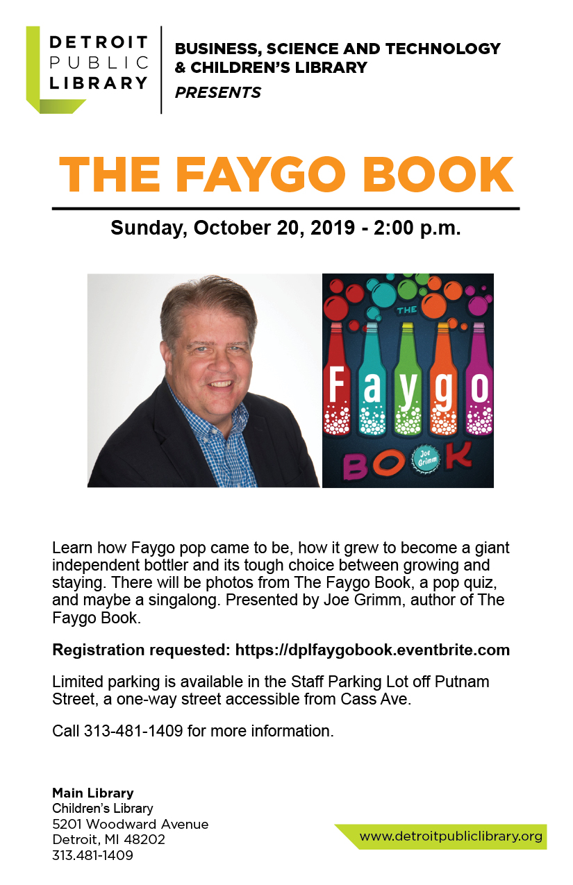 Joe has talked about his history of Faygo at many libraries in Michigan, and has gotten rave reviews here on Michlib-l. We're going to have him at DPL's Main Branch this coming Sunday, from 2:00-4:00. If some of your patrons or staff were upset that they missed his presentation, here is another opportunity for them. There is parking in the staff lot off of Putnam on Sundays. Glad to give more information to anyone that wants it. Jennifer Jennifer Dye Children's Librarian, Assistant Manager Children's Library/HYPE Main Branch Detroit Public Library jdye@detroitpubliclibrary.org Main Branch T, W 12-8 Th, F, Sat 10-6 Sun 1-5 5201 Woodward Ave. Detroit, Michigan 48202 313-481-1409 [DPL Logo]<http://www.detroitpubliclibrary.org> Detroit Public Library Disclaimer This message contains confidential information and is intended only for the individual(s) addressed in the message. If you are not the named addressee, you should not disseminate, distribute, or copy this e-mail. If you are not the intended recipient, you are notified that disclosing, distributing, or copying this e-mail is strictly prohibited.