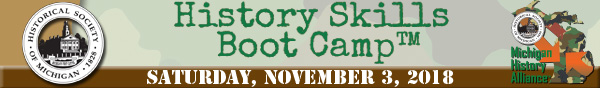 Looking for training to enhance your skills in historic preservation or living history? Join us for our new one-day jam-packed history skills "Boot Camp"! Attend a full day of workshops to hone your skills in the areas of reenacting, historic restoration, improving and expanding your organization, engaging new visitors and volunteers, and more! This event is open to ALL! We encourage individuals looking to learn a brand new skill or experienced historical organization professionals interesting in widening their knowledge to join us. Saturday, November 3, 2018 Lansing Community College-West Campus. <http://hsmichigan.org/conferences/boot-camp/boot-camp-registration/> Go to online registration for Boot Camp. <https://hsmichigan.org/wp-content/uploads/2018/09/Boot-Camp-brochure-online .pdf> Download the Boot Camp brochure here. The History Skills Boot CampT offers. . Four tracks that cover a range of popular topics. You can follow one track all the way through or mix and match to fit your needs. o Historic Preservation Track Learn skills to bring your historical house or building back to life! o <https://hsmichigan.org/wp-content/uploads/2018/09/Boot-Camp-brochure-online .pdf> Reenactors and Living History Track It doesn't matter who you portray-these sessions cover ALL eras! o History Skills In-Reach Track Learn new skills to improve and expand your museum or organization! o History Skills In-Reach Track Learn additional skills to engage members, visitors, and volunteers! . Luncheon Keynote o Network with new friends, enjoy a refreshing lunch, and listen to our luncheon keynote! o Keynote: Mythbusters-History Lies That Won't Die With Bob Myers, Historical Society of Michigan . Networking opportunities Come see what all the excitement is about! Registration deadline is October 29, 2018. _____ _____ The Historical Society of Michigan is our state's oldest cultural organization, founded in 1828 by territorial governor Lewis Cass and explorer Henry Schoolcraft. A nongovernmental nonprofit, the Society focuses on publications, conferences, education, awards and recognition programming, and support for local history organizations to preserve and promote Michigan's rich history. _____ For more information on the Historical Society of Michigan, please visit <http://www.hsmichigan.org/> www.hsmichigan.org or e-mail us at <mailto:hsm@hsmichigan.org> hsm@hsmichigan.org. _____ The Historical Society of Michigan 5815 Executive Dr. . Lansing, MI 48911 Phone: (517) 324-1828 . FAX: (517) 324-4370 Track 1: Historic Preservation History S.O.S.: Restoration Resources If These Bricks Could Talk: Researching and Telling Your House's Story cid:image022.jpg@01D44C2B.C8AEF180 Memories and Monuments: Gravestone Care and Repair Coats of Many Colors: Painting Your Old House Track 2: Reenactors and Living History Who Are You? Eras and Characters The Fabrics of History: Authentic Clothing on a Shoestring Budget Acting 101: Playing Your Part The Good, the Bad, and the Ugly: Portraying the Challenging Side of History <http://hsmichigan.org/conferences/boot-camp/boot-camp-registration/> Go to online registration for Boot Camp. <https://hsmichigan.org/wp-content/uploads/2018/09/Boot-Camp-brochure-online .pdf> Download the Boot Camp brochure here. This e-mail is sent to our members and friends to keep you updated on historical activities and opportunities to learn more about our state's history. To opt-out, please respond to this e-mail with "remove" in the subject line. If you received this e-mail as part of your participation in the Michlib-l mailing list (listserv), please follow their removal process.