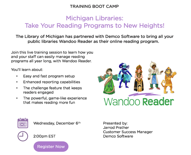 Michigan Public Libraries: take your reading programs to new heights! Join us LIVE on Wednesday, December 6th at 2:00 PM EST https://register.gotowebinar.com/register/6942880853667747841 You'll learn about: * Easy & Fast program setup * Enhanced reporting capabilities * The challenge feature that keeps readers engaged AND MORE!!!! Presented by: Jarrod Prather, Customer Success Manager with Demco Software Next live webinar: Wednesday, January 3rd. Details TBA [MI WR Boot Camp_12.6.17] Cathy Lancaster Youth Services Coordinator Library of Michigan 702 W. Kalamazoo St. Lansing, MI 48915 LancasterC5@michigan.gov<mailto:LancasterC5@michigan.gov> | 517-335-8129 | www.mi.gov/libraryofmichigan<http://www.mi.gov/libraryofmichigan> Follow us: Facebook<https://www.facebook.com/libraryofmichigan/> | Twitter<https://twitter.com/libraryofmich> | Instagram<https://www.instagram.com/libraryofmichigan/>