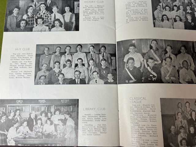 Hello, We rescued a 1944 Loren M Post School yearbook from our book sale. It is in good shape and has some signatures. If you are interested let me know your RIDES code and I will send it out to you. Julie -- Julie Preneta, Director Leelanau Township Library 119 E Nagonaba Street, PO Box 235 Northport, MI 49670 231-386-5131 she/her/hers *Currently reading:* *Wild dark shore by Charlotte McConaghy* www.leelanautownshiplibrary.org [image: IMG_5001 (2).jpg] [image: IMG_5002.jpg] [image: IMG_4999.jpg]