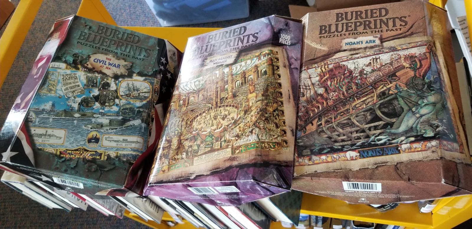 We swapped some puzzles with another library for a puzzle tournament but one bin was lost in the delivery through RIDES. We are past the 60 day mark for reporting to RIDES so I am just putting this out there to see if someone has a bin of 7 awkwardly shaped wayward boxes of puzzles. We sent them on October 23, 2 bins. One bin had 6 puzzles and was delivered correctly to Grosse Pointe Public Library, Central Branch. The other bin of 7 puzzles was never delivered. I did not let GPPL know how many I was sending and started asking about the other bin when we received the 6 back from them. I have attached a picture of the type of puzzles we sent, all were from the same manufacturer but all different themes, 1000 pieces. -- *Betsy Myers* Reference Department Interlibrary Loan/Programming *Traverse Area District Library* 610 Woodmere Ave Traverse City, MI 49686 231 932-8502 *What am I reading? Non-fiction, if you can believe it. Good Husbandry by Kristin Kimball <https://catalog.tadl.org/main/search?query=kimball%2C+kristin&qtype=keyword&sort=relevancy&in_progress=true&loc=22&fmt=all&commit=> (I would read The Dirty Life first to enjoy this more.)*