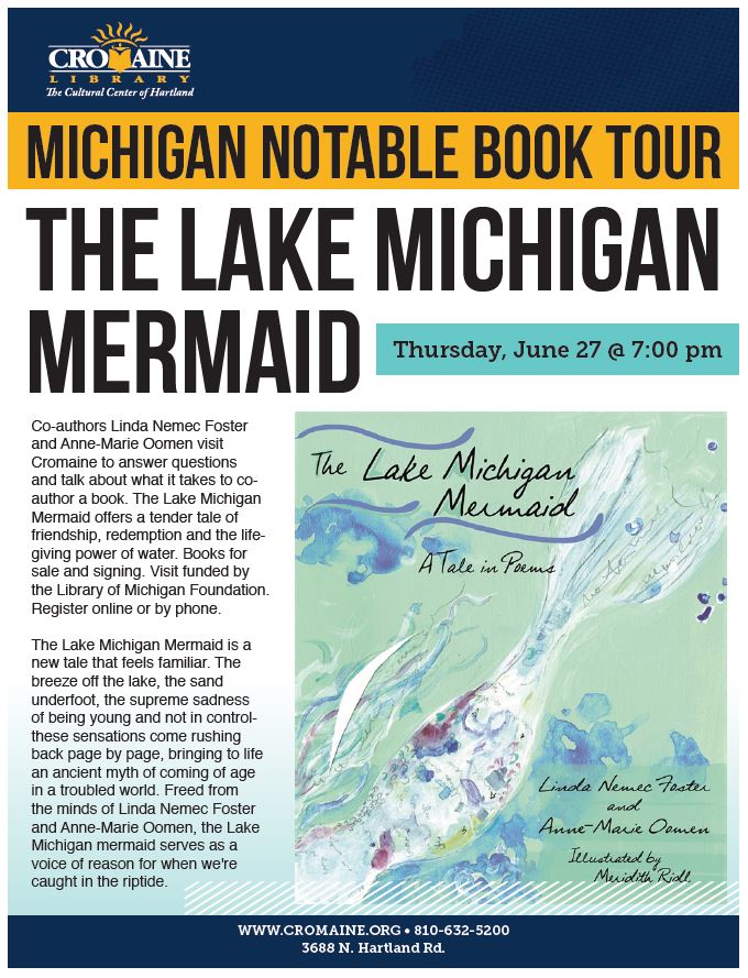 Cromaine is excited to host Linda Nemec Foster and Anne-Marie Oomen -- authors of The Lake Michigan Mermaid <https://catalog.tln.lib.mi.us/?section=resource&resourceid=18394833>-- at the Library at 7:00 pm on June 27, 2019 for an evening of first-rate storytelling; book signing and question-and-answer time with guests. Foster and Oomen are visiting Cromaine as part of the Library of Michigan’s 2019 “Michigan Notable Authors Tour.” Hartland's Cromaine Library is located at 3688 N. Hartland Road, Hartland, MI 48353. Please join us and we invite you to share the event with your patrons. Stefanie Furge Community Engagement sfurge@cromaine.org