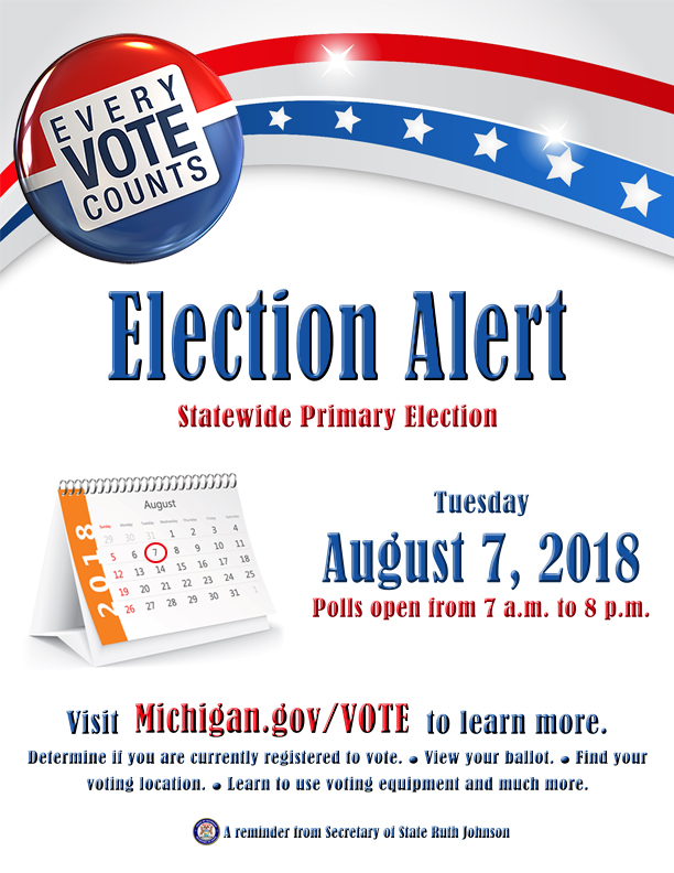Good afternoon! The Michigan Secretary of State's office is hoping you can help us spread the word about the upcoming election on August 7. This is a statewide election, so we are asking all libraries to post the attached flyer and share the following message via your communication channels. On Monday, August 6, we will send you a social media message that we hope you will share as a final reminder to vote. As always, thank you for your help! Election Alert August 7 Statewide Primary Election Secretary of State Ruth Johnson is once again encouraging all eligible voters in Michigan to cast their ballots in the statewide primary election on Tuesday, August 7. Polls are open on Election Day from 7 a.m. to 8 p.m. To view your ballot ahead of time or to find your voting location, visit www.michigan.gov/vote<http://www.michigan.gov/vote>. With much gratitude, Cathleen Simlar Cathleen P. Simlar Communications Specialist, Executive Office Michigan Department of State Office: (517) 373-9080 Cell: (248) 761-7145 Email: Simlarc@michigan.gov<mailto:Simlarc@michigan.gov> Join My Professional network on LinkedIn<blocked::http://www.linkedin.com/pub/cathleen-simlar/18/798/235> [Description: Description: Description: SOS logo small] <http://www.michigan.gov/sos> STAY CONNECTED: [Description: Description: Description: Facebook logo]<http://www.facebook.com/MichiganSoS> [Description: Description: Description: Twitter logo] <https://twitter.com/michsos> [Description: Description: Description: YouTube logo] <http://www.youtube.com/michsosoffice> [Description: Description: Description: GovDelivery logo] <https://public.govdelivery.com/accounts/MISOS/subscriber/new>