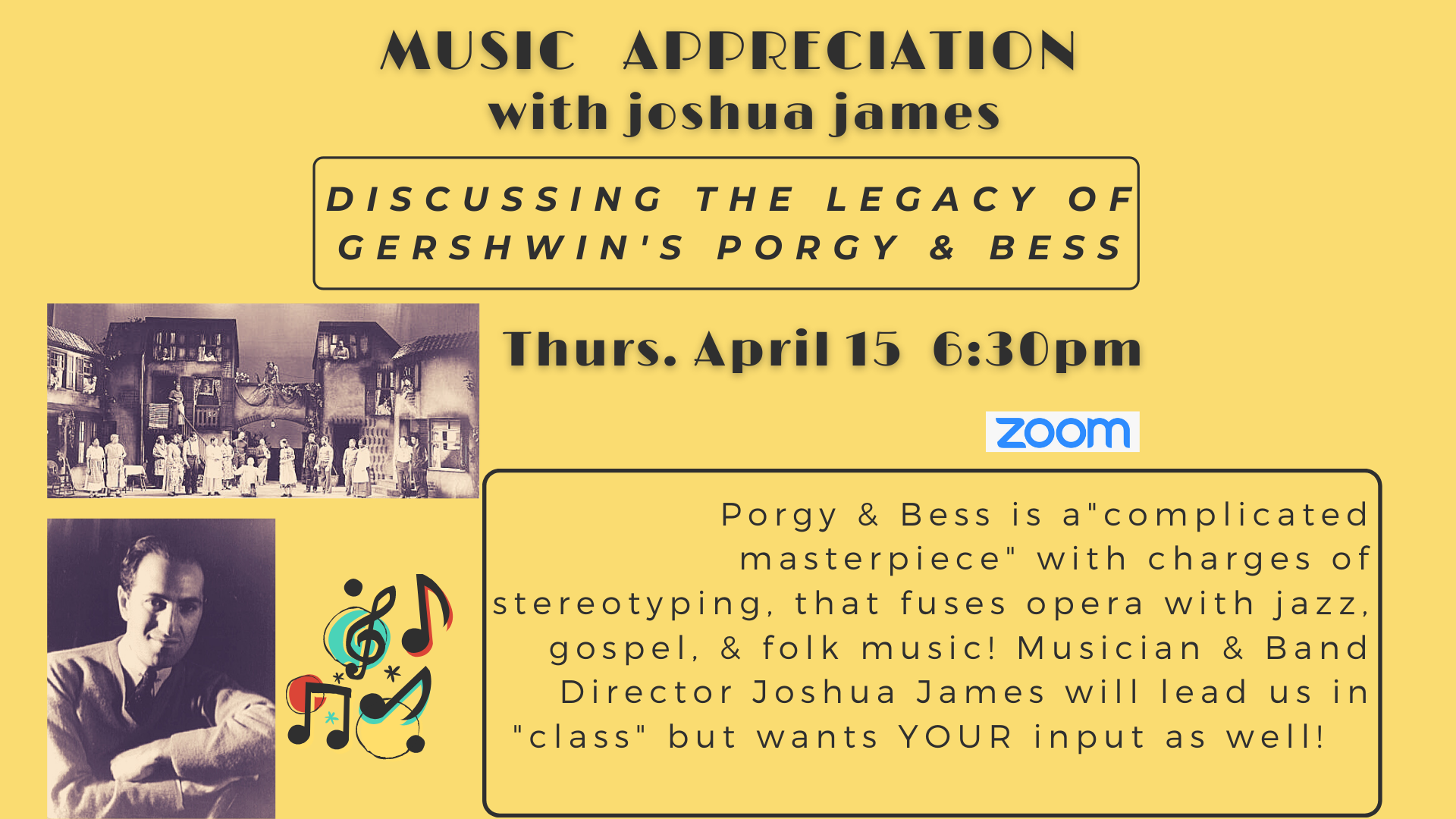An interactive, multimedia discussion with jazz musician, bandleader, and music teacher Joshua James Sign up here: http://tiny.cc/operatalk <https://l.facebook.com/l.php?u=http%3A%2F%2Ftiny.cc%2Foperatalk%3Ffbclid%3DIwAR0MAouePzzApDztRN4SmBf2boeBdByOVDK_FCZ5WttRcHWE5z3lcI3nUgQ&h=AT0K1jbpgkohRwLdWtupK5LfebXw6s7yK-4NmnZ-7zF3VGOh1hVYCv4357nQbZWzdWOchGhG0mOuy3Ezgw9L6s7F9-91lyc3VWoTHWi64DTc95lD4VjbZfdLR-NMH1BI7dY0VKM66IuM4RaJBQ&__tn__=q&c[0]=AT3CcrrFsaD4M9GingYdeRpHL-mnGyQ4oTcvWwkRvz0zTV2PxiGTxZaWfTzQocKEmTIkdELAuQUSW-pKQdeWDOM0KUWxuaYgFu4pyxl4i2mfugzP1QA0wV4-TrCjpGSLKIcjip5599-q3T1THUyNRPy6> Music Appreciation with Joshua James - Thurs, 4/15 - 6:30pm (Zoom) Discussing the Legacy of Gershwin's Porgy & Bess _____________ Let's learn about (& discuss) this "American folk opera" from the 1930s. "Porgy and Bess" is viewed as a complicated masterpiece that has been both revered and reviled. Is it a sincere celebration of the Gullah culture and African roots, or a controversial perpetuation of stereotypes? Is it an opera or a musical? Is it written through the idiom of jazz? Or are they gospel or folk? What should we take away from the narrative's depictions of the Gullah people? What's the historical context around Gerswhin's composition? And what is it about Porgy and Bess that inspires continual revivals and reinterpretations each decade? James will lead us in a class that explores all of these questions, but our teacher also wants this to be a discussion! So all fans of musicals, operas, jazz, and anyone who has seen any iteration of Porgy & Bess, be it on stage or on film, is encouraged not only to attend but to engage. Let's learn, let's talk, and let's also listen to some music! https://www.facebook.com/events/1344376879269812