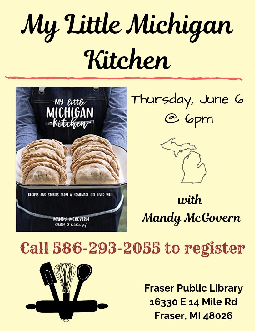 Hello, The Fraser Public Library is pleased to host author Mandy McGovern, creator of Kitchen Joy. She will be here from 6-7pm on Thursday, June 6 at the Fraser Public Library, 16330 E. 14 Mile Rd, Fraser MI. Mandy will have some homemade treats to sample. There will be copies of her book, My Little Michigan Kitchen for purchase at the program. You won’t want to miss this delicious event! To register, please follow the link: http://fraser.evanced.info/signup/EventDetails?EventId=616&backTo=Calendar&startDate=2019/06/03 Thank You, Megan Fillinger Youth and Programming Librarian Fraser Public Library 16330 E. 14 Mile Rd. Fraser, MI 48026 586-293-2055