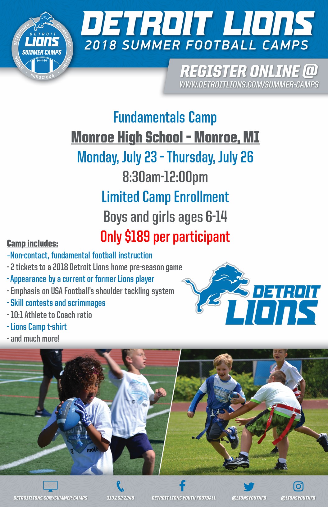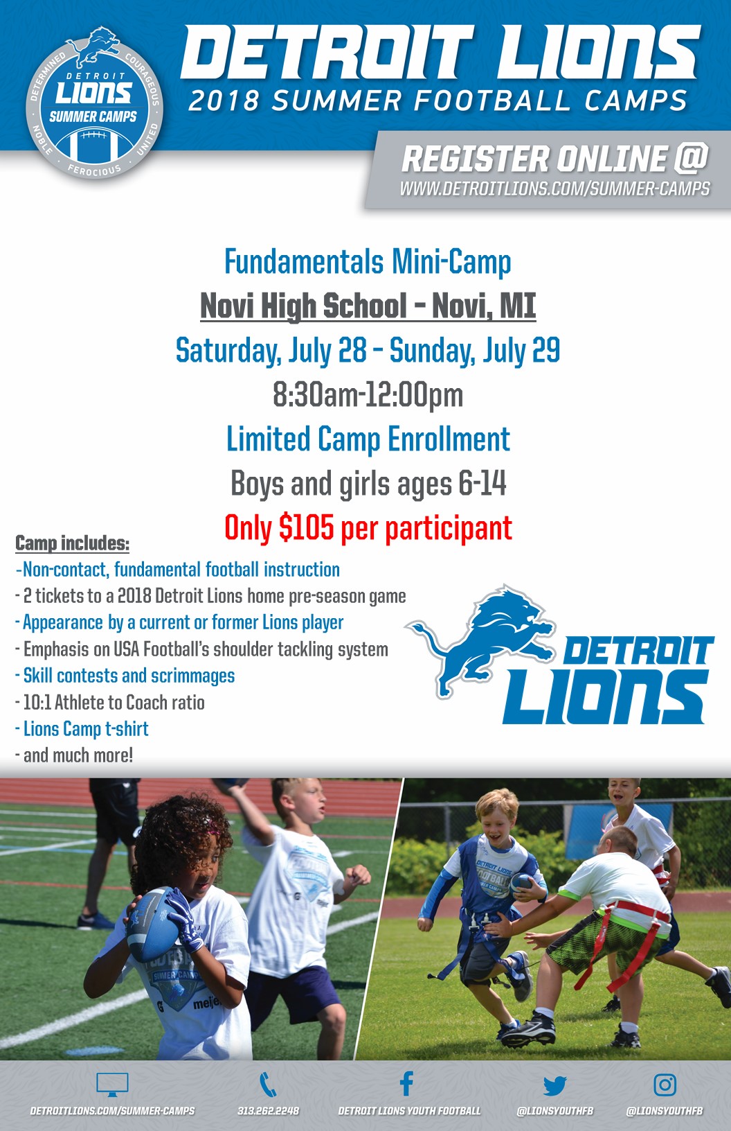 Attached are flyers from Detroit Lions for their summer football camps. Feel free to distribute the information to youth as you'd like. Below are more details, a contact and the website if you are on the digest format for this list and can't view attachments. Cathy Lancaster Youth Services Coordinator Library of Michigan 702 W. Kalamazoo St. Lansing, MI 48915 LancasterC5@michigan.gov<mailto:LancasterC5@michigan.gov> | 517-335-8129 | www.mi.gov/libraryofmichigan<http://www.mi.gov/libraryofmichigan> Follow us: Facebook<https://www.facebook.com/libraryofmichigan/> | Twitter<https://twitter.com/libraryofmich> | Instagram<https://www.instagram.com/libraryofmichigan/> Our collective efforts can help make Michigan a Top 10 education state in 10 years! Here are the goals and strategies: http://mi.gov/top10in10/ [cid:image002.png@01D20444.B08921B0] From: Morris, Sean <Sean.Morris@lions.nfl.net> Sent: Tuesday, May 22, 2018 2:44 PM To: Lancaster, Catherine (MDE) <LancasterC5@michigan.gov> Subject: Detroit Lions Summer Camps Hello Cathy, My name is Sean Morris and I am with the Detroit Lions Football Education department. We are asking for your assistance of promoting our Summer Camps to your Library Youth Programs! Our mission is to give every camper a positive experience of learning character development and safety within the game of football. Attached are flyers of camps that will be in the area of your libraries. We would be willing to mail copies as well! Let me know what you think and we can go from there! Thank you for your time. [cid:image005.png@01D27B0E.51E95350] SEAN MORRIS / FOOTBALL EDUCATION INTERN OFFICE: 313.262.2248 / DIRECT 313.262.2817 2000 BRUSH STREET, SUITE 200 DETROIT, MI 48226 WWW.DETROITLIONS.COM/SUMMER-CAMPS