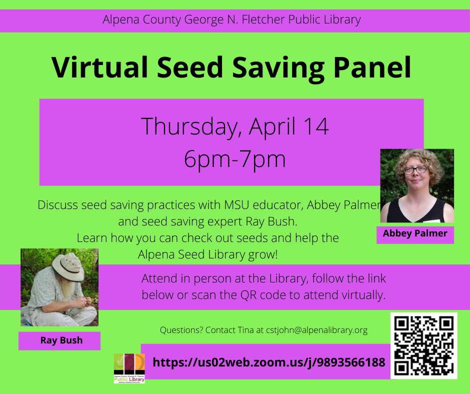 Virtual Seed Saving Panel April 14, 2022 6PM-7PM The Alpena County Library is excited to host a virtual seed saving panel with MSU educator Abbey Palmer, seed saving expert, Ray Bush, and Queen City Seed Library's own Mike Riesterer. Discuss ways to save seeds from experts and learn more about Alpena Seed Library. Abbey Palmer is a Community Food Systems Educator. She works with schools and farms throughout the Upper Peninsula. Ray Bush works with organizations to further seed saving with demonstrations, workshops, and presentations. Mike Riesterer helps to run the Queen City Seed Library located at Peterwhite Public Library and it's annual seed swap. Attend via zoom at https://us02web.zoom.us/j/9893566188. Tina Markowski Dept. Head of Public Services Alpena County George N. Fletcher Public Library (989) 356-6188 X16