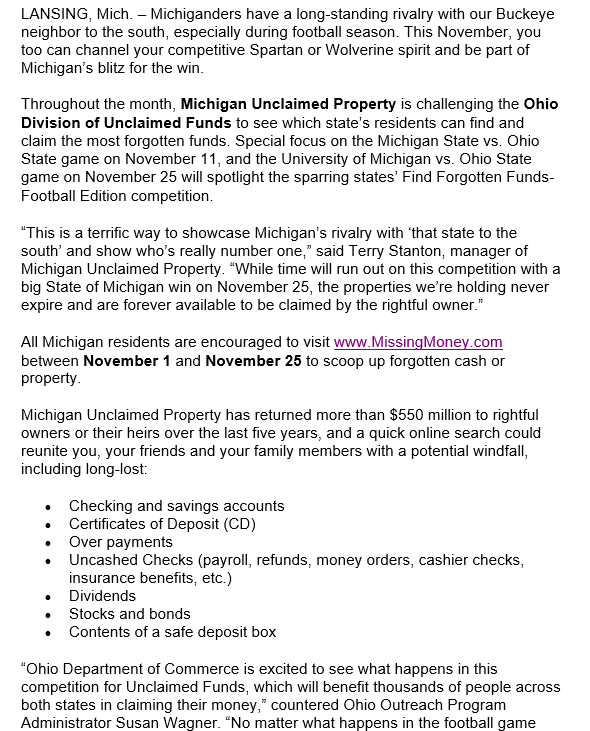 Hello, I read an email this morning (see below from Treasury) and so I was searching Michigan's Unclaimed Property website and making sure that my library doesn't have any outstanding refunds out there. Unfortunately, I do not, but many libraries do! There are 5 pages of worth of Michigan Libraries that have some unclaimed property out there, check and see if you are one of them! https://unclaimedproperty.michigan.gov/ Good luck!!
