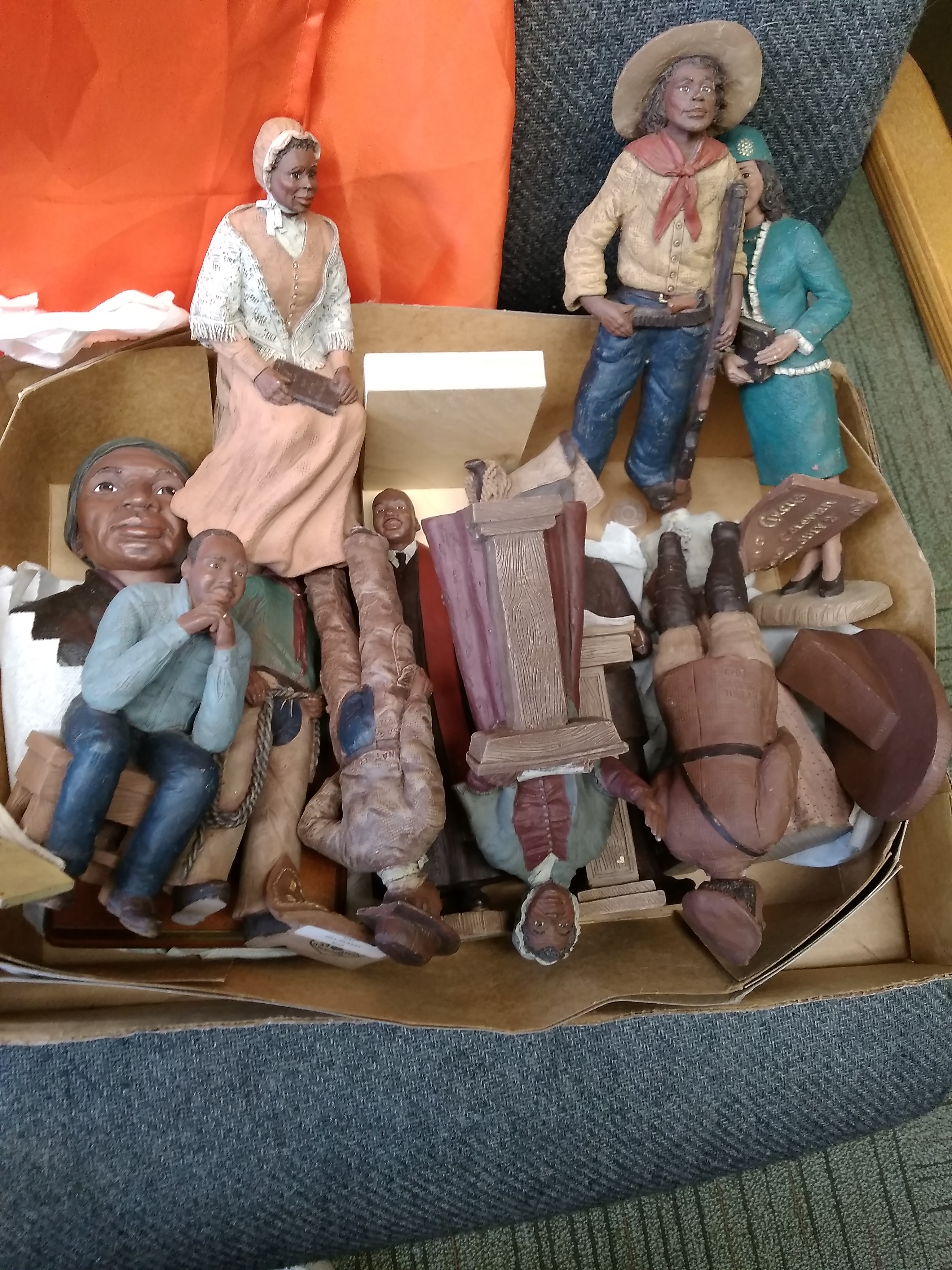 Here is a box of 10 figurines from Sarah's Attic. Includes Sojourner Truth, Bill Pickett, Martin Luther King Jr., Harriet Tubman, Coretta Scott King, Bessie Coleman and others. Free to the first who may want it. Wonderful for display. Joann @ Hudson Sent from Yahoo Mail on Android