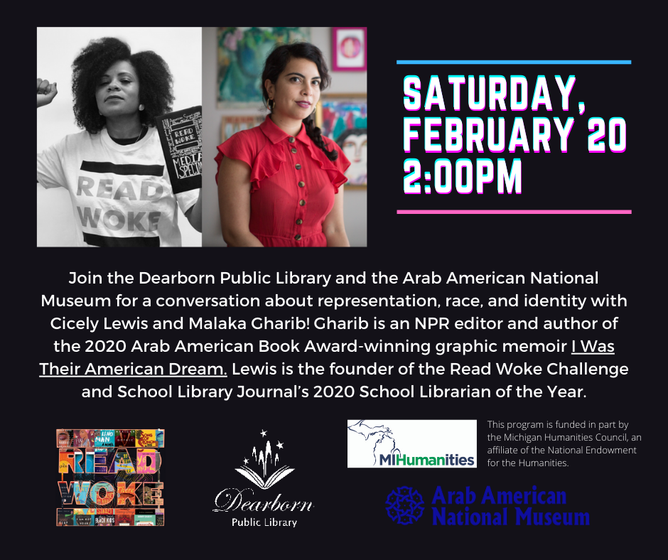 Hello! The Dearborn Public Library in partnership with the Arab American National Museum is hosting a virtual conversation about representation, race, and identity this Saturday, February 20th at 2:00pm with Malaka Gharib and Cecily Lewis. Gharib is an NPR editor and the author of the 2020 Arab American Book Award-winning graphic memoir I Was Their American Dream. Lewis is the founder of the Read Woke Challenge, and also School Library Journal's 2020 School Librarian of the Year. This event is part of the Dearborn Public Library's Read Woke Challenge. To learn more about our Challenge, visit: https://dearbornlibrary.org/wordpress/read-woke/ Everyone is welcome to attend! It will be over Zoom, but we are also live streaming it through our Facebook page and the Museum's as well. To register for this free event, visit: https://arabamericanmuseum.org/event/read-woke-with-cicely-lewis-malaka-ghar... This project is funded in part by Michigan Humanities, an affiliate of the National Endowment for the Humanities. Thank you for your time and stay safe, Laura Geiken Teen Librarian Dearborn Public Library (313) 943-3344 dearbornlibrary.org<http://dearbornlibrary.org/>