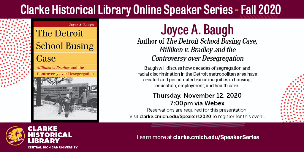 On Thursday, November 12, at 7:00 pm, the Clarke Historical Library will host Dr. Joyce A. Baugh, retired professor of political science at Central Michigan University. Dr. Baugh will discuss how decades of segregation and racial discrimination in the Detroit metropolitan area have created and perpetuated racial inequities in housing, education, employment, and health care. Dr. Baugh is the author of The Detroit School Busing Case, Milliken v. Bradley and the Controversy over Desegregation. Her book examines the landmark 1974 Supreme Court decision<https://en.wikipedia.org/wiki/Milliken_v._Bradley> that effectively ended a major school integration plan to bus students across district lines in the Detroit metropolitan area. The Court's 5-4 decision hinged on the idea that if predominantly white school districts did not have an explicit policy of segregation, communities could not mandate busing to address the de facto segregation of schools that resulted from the geographic segregation of where people lived. This presentation is free and open to the public. The event will be broadcast via Central Michigan University's videoconferencing tool, Webex, and it will be recorded to enjoy at a later time. Registration is required for the event and the shortened link to register is: https://bit.ly/32mZmUf For those interested in the Clarke Historical Library Speaker Series Events that have been recorded this fall (A look at the Clarke's pop-up book exhibit, Matthew Reinhart on pop-up books, Carl Doud on mosquitoes and malaria, and Miles Harvey on James Jesse Strang), you can find them on YouTube<https://www.youtube.com/channel/UCIxEoD5u5xz2cxprWzIPJXw>. Feel free to share this information far and wide! The Clarke is happy to answer any questions that anyone may have-please contact Bryan Whitledge (whitl1br@cmich.edu<mailto:whitl1br@cmich.edu>). Have a great day, Bryan Whitledge Archivist for University Digital Records Clarke Historical Library Central Michigan University 989-774-2159 whitl1br@cmich.edu<mailto:whitl1br@cmich.edu>