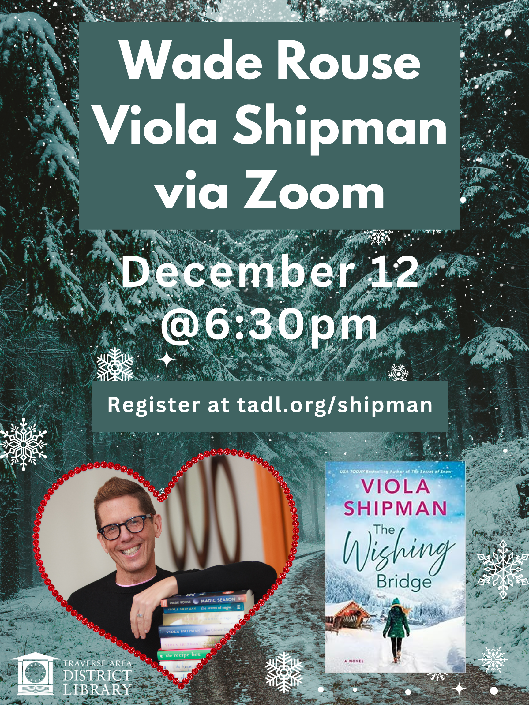 This event is still a couple weeks away but I wanted to let all of you know about it so you can register or promote if you want to. When you register, you will receive a reminder email about the event so you won't forget about it. This is a Zoom Only event so we invite all of you to join us from the comfort of your home. We will be hosting *Wade Rouse aka Viola Shipman on December 12 @ 6:30pm via Zoom*. He will be talking about his newest book "The Wishing Bridge" that came out at the beginning of November. Have you read it? You should!! Full of fun and sweetness. It will make you mad *and *happy. It is reminiscent of Christmas past and future and will literally (well...not *literally*) engulf you with Christmas cheer. So come one, come all--everyone is invited! Wade is so full of enthusiasm and I can't wait to meet him. How about you? Register here: *tadl.org/shipman <http://tadl.org/shipman>* -- *Betsy Myers* Reference Department Interlibrary Loan/Programming *Traverse Area District Library* 610 Woodmere Ave Traverse City, MI 49686 231 932-8502