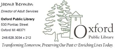 Dear Colleagues, Sarah Matuszak of Happy Snapper Rescue delivered an astounding and inspiring presentation including live turtles at the Oxford Public Library- well attended and positively appreciated! We will definitely have her back! She answered a million curious questions and gave a family friendly educational presentation! Contact: https://www.facebook.com/happysnapperrescue/about (586) 489-0386 happysnapperrescue@gmail.com Description: ALL AGES! Happy Snapper Rescue organizer and educator Sarah Matuszak will bring turtles to the library and give us exciting information on turtle rescue and rehabilitation. Sarah is a passionate animal supporter, founded Happy Snapper Rescue for turtle rehabilitation and conservation. They also rescue injured and orphaned opossums. Jaema [cid:image003.jpg@01DBA24C.C9457C30] Currently reading: The God of the Woods by Liz Moore