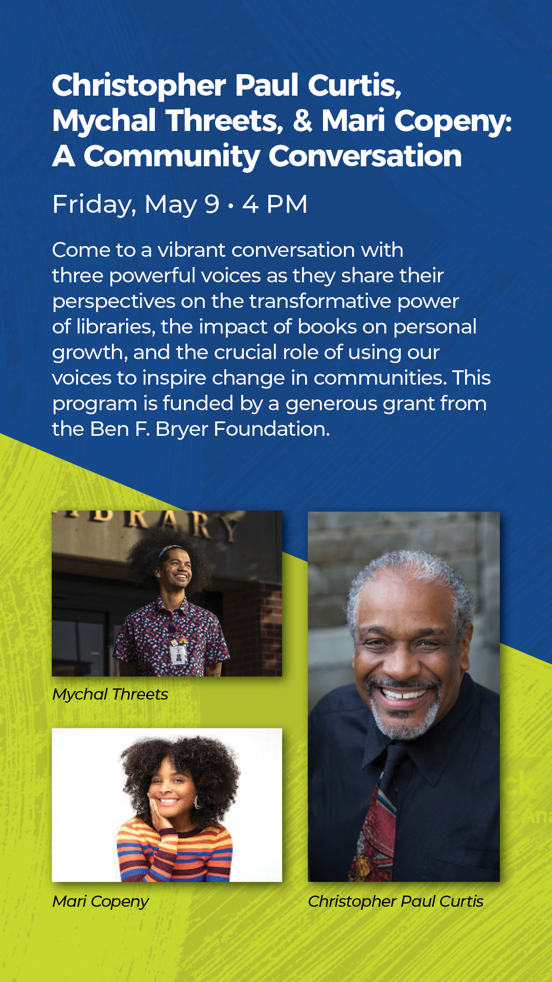 Gather 'Round the Table with Teens: A Food Literacy Workshop Food literacy is essential for teens to understand and learn about food in a positive way, including food skills and best food practices. Library staff that work with tweens & teens will benefit from this workshop designed to guide libraries to in turn support teens as they explore the impact of food on so many levels of their lives. Food Education Consultant Rebecca Antill will provide in-person workshops on how to plan and deliver nutrition & cooking programs for teens, featuring how to do so with minimal kitchen access. As a former librarian, Rebecca will offer a tailored learning experience that will equip library staff to offer food programming of all levels at their libraries. Basic health and safety information, kitchen classroom management, culinary skills and community partners will all be discussed as participants cook and share time together. Bring your own apron as this cooking workshop is hands-on and very interactive! Workshops will be offered in three locations across the state and registration is very limited<https://libraryofmichigan.app.neoncrm.com/np/clients/libraryofmichigan/eventList.jsp>: Monday, May 5, 2025 10:00 AM - 5:00 PM ET Jackson District Library's Meijer Branch 4699 Airport Road, Jackson, 49202 Registration & Details: https://libraryofmichigan.app.neoncrm.com/np/clients/libraryofmichigan/event.jsp?event=7470& Wednesday, May 7, 2025 10:00 AM - 5:00 PM ET Traverse Area District Library's Woodmere Library 610 Woodmere Ave., TC 49686 Registration & Details: https://libraryofmichigan.app.neoncrm.com/np/clients/libraryofmichigan/event.jsp?event=7475& Friday, May 9, 2025 *9:00 AM - 4:00 PM ET Gloria Coles Flint Public Library 1026 E. Kearsley St., Flint, 48503 *Please note the earlier start time for this workshop, due to the special GCFPL event following the workshop at 4pm - details below. Registration & Details: https://libraryofmichigan.app.neoncrm.com/np/clients/libraryofmichigan/event.jsp?event=7480& Christopher Paul Curtis, Mychal Threets, & Mari Copeny: A Community Conversation<https://drive.google.com/file/d/1lVvOR0jA-Jsy7A9lxqy9Jqmb4AZr_4-U/view?usp=sharing> Friday, May 9, 2025 4:00 PM Gloria Coles Flint Public Library Come to a vibrant conversation with three powerful voices as they share their perspectives on the transformative power of libraries, the impact of books on personal growth, and the crucial role of using our voices to inspire change in communities. [cid:image001.jpg@01DBA22E.B1B5F950] The food literacy workshops are supported in part by the Institute of Museum and Library Services. Cathy Lancaster Youth Services Coordinator Library of Michigan 702 W. Kalamazoo St. Lansing, MI 48915 My Pronouns: She/Her/Hers - See www.mypronouns.org<http://www.mypronouns.org/> to learn more. LancasterC5@michigan.gov<mailto:LancasterC5@michigan.gov> | 517-335-8129 | www.mi.gov/libraryofmichigan<http://www.mi.gov/libraryofmichigan> Follow us: Facebook<https://www.facebook.com/libraryofmichigan/> | Twitter<https://twitter.com/libraryofmich> | Instagram<https://www.instagram.com/libraryofmichigan/> Join the MiYouth<https://lists.mcls.org/mailman/listinfo/miyouth> Listserv, created for Michigan public library staff to share and discuss children and teen programming and services.