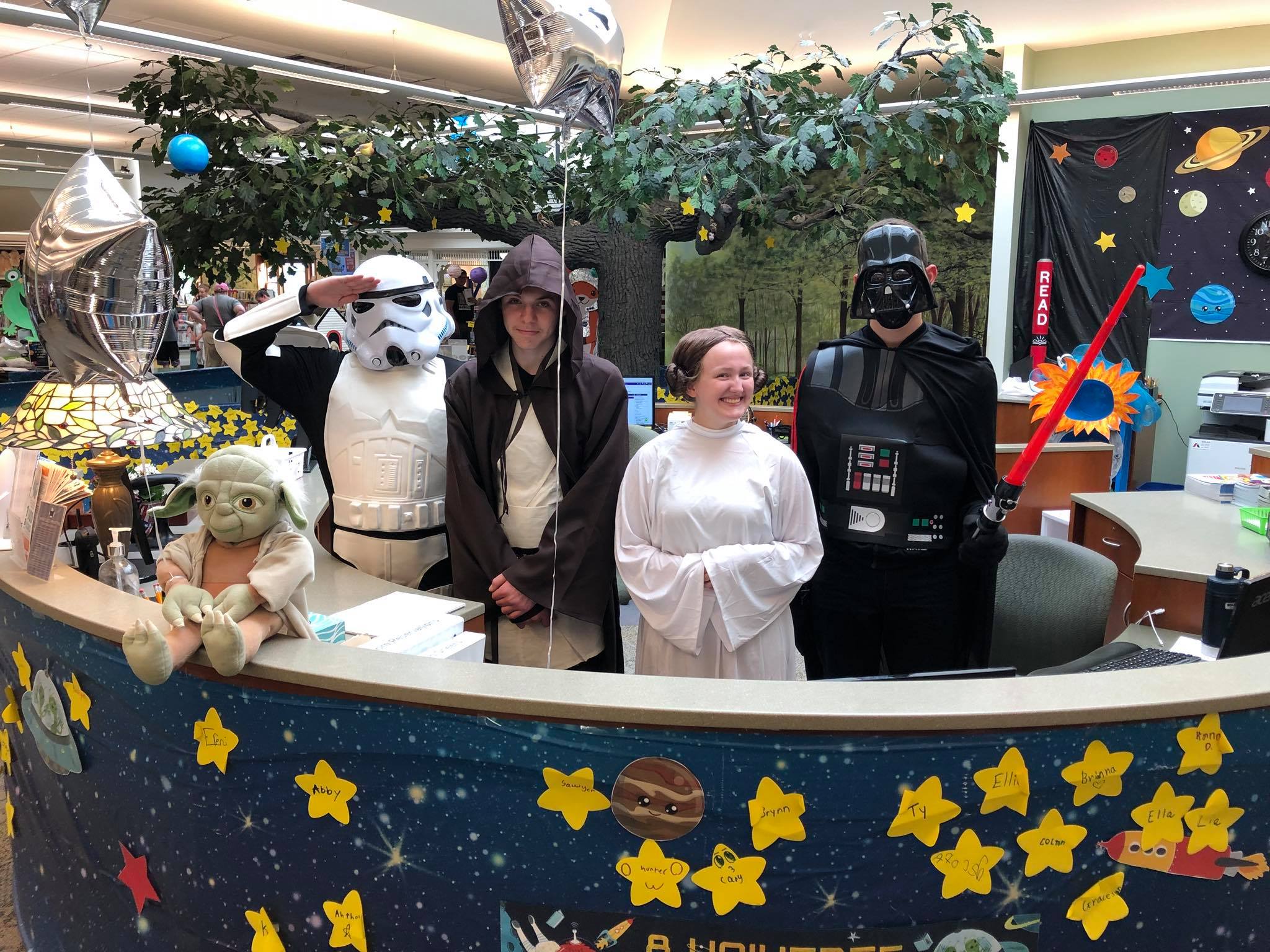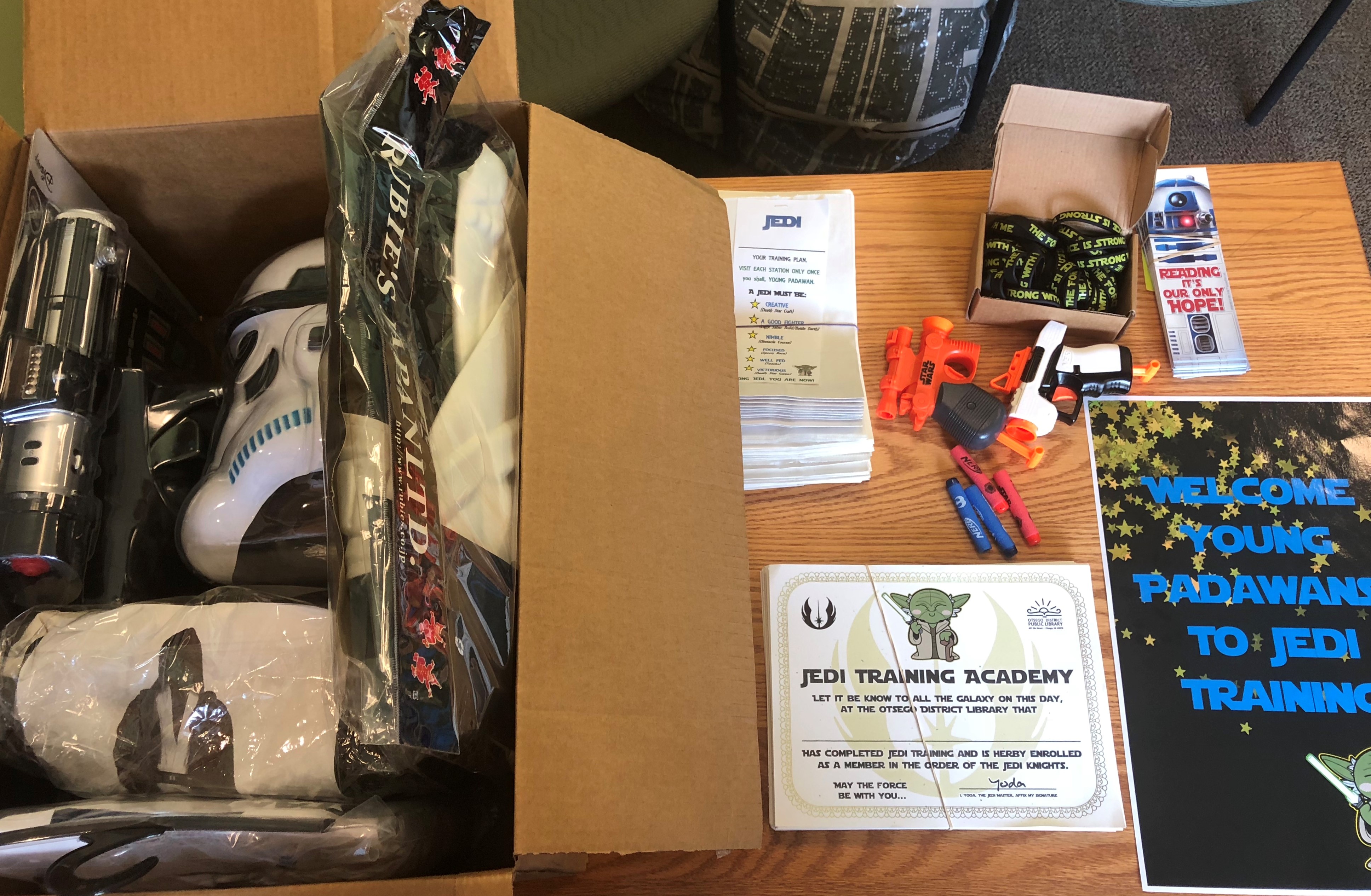 Hi All, We had a very fun Jedi training program at ODL this week and have some leftovers from it that may be useful to some other library. Star Wars Jedi Training program in a box includes: $175 Darth Vader Costume with lightsaber size Adult One Size fits all Luke Skywalker Costume size Adult one size fits all Princess Leia Costume size Adult Medium Stormtrooper Costume size Adult Medium Inflatable Death Star 71 cardstock Jedi Training Certificates (has a 1 inch ODL logo that could be covered with a sticker) 58 Jedi training bags with stations listed on them 2 Star wars Nerf shooters 40 The Force is Strong with Me bracelets 84 Reading is our only Hope R2D2 bookmarks Giant inflatable Death Star (Pictures attached) If you are interested in this, please respond off the listserv. You can see pictures of our program on our Facebook page! It was a blast. Have a great day, Andrea Andrea Estelle, MLIS Library Director . Otsego District Public Library Brighten the Corner Where You Are! 401 Dix Street, Otsego MI 49078 (269) 694-9690 <http://www.otsegolibrary.org/> www.otsegolibrary.org LIKE us on Facebook!