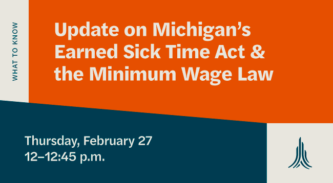 Wondering how to comply with the new minimum wage and sick time laws? The Michigan Department of Labor and Economic Opportunity (LEO) is hosting a webinar today at 12 noon to explain the changes and answer questions! See below: [LEO Banner] -- JOIN US THIS THURSDAY -- Join LEO for a Webinar on Minimum Wage and Earned Sick Time Changes [webinar thursday]<https://links-1.govdelivery.com/CL0/https:%2F%2Fteams.microsoft.com%2Fl%2Fmeetup-join%2F19%253ameeting_NmM2NzgyN2QtOWM3OS00NjUzLWE5OTktZTg0NDRjOWYzN2Iw%2540thread.v2%2F0%3Fbtype=a%26context=%257B%2522Tid%2522%253A%2522d5fb7087-3777-42ad-966a-892ef47225d1%2522%252C%2522Oid%2522%253A%252210889d4e-8b02-45b3-a2b1-8b8bde869560%2522%252C%2522IsBroadcastMeeting%2522%253Atrue%252C%2522role%2522%253A%2522a%2522%257D%26role=a%26utm_medium=email%26utm_source=govdelivery/1/010001953de78aad-c1ff73af-951f-44f4-a4ab-c147dfd9f5e6-000000/FBvI7ILcqMS63ZwOn_L-2B6uAsilVTYn5IyTlo_exX0=393> The Michigan Department of Labor and Economic Opportunity (LEO) is hosting a webinar to help you understand recent changes to Michigan’s wage and earned sick time laws. Learn what these updates mean for you and get your questions answered. LEO Deputy Director of Labor Sean Egan will host a live webinar to discuss how the new laws will affect workers and businesses. Join the Webinar Thursday, Feb. 27 Noon to 12:45 p.m. [join the event button]<https://links-1.govdelivery.com/CL0/https:%2F%2Fteams.microsoft.com%2Fl%2Fmeetup-join%2F19%253ameeting_NmM2NzgyN2QtOWM3OS00NjUzLWE5OTktZTg0NDRjOWYzN2Iw%2540thread.v2%2F0%3Fbtype=a%26context=%257B%2522Tid%2522%253A%2522d5fb7087-3777-42ad-966a-892ef47225d1%2522%252C%2522Oid%2522%253A%252210889d4e-8b02-45b3-a2b1-8b8bde869560%2522%252C%2522IsBroadcastMeeting%2522%253Atrue%252C%2522role%2522%253A%2522a%2522%257D%26role=a%26utm_medium=email%26utm_source=govdelivery/2/010001953de78aad-c1ff73af-951f-44f4-a4ab-c147dfd9f5e6-000000/Rwp040IoIBW1EeXMz0rgNps4PlZrIjqvuObFNhLFKIQ=393> Join the webinar virtually via Microsoft Teams <https://links-1.govdelivery.com/CL0/https:%2F%2Fteams.microsoft.com%2Fl%2Fmeetup-join%2F19%253ameeting_NmM2NzgyN2QtOWM3OS00NjUzLWE5OTktZTg0NDRjOWYzN2Iw%2540thread.v2%2F0%3Fbtype=a%26context=%257B%2522Tid%2522%253A%2522d5fb7087-3777-42ad-966a-892ef47225d1%2522%252C%2522Oid%2522%253A%252210889d4e-8b02-45b3-a2b1-8b8bde869560%2522%252C%2522IsBroadcastMeeting%2522%253Atrue%252C%2522role%2522%253A%2522a%2522%257D%26role=a%26utm_medium=email%26utm_source=govdelivery/3/010001953de78aad-c1ff73af-951f-44f4-a4ab-c147dfd9f5e6-000000/bm7Z6DGiI7pbhUxYvfpVgyUTXsgg1Ib_9cWYlX1BR1E=393> Senate Bill 8<https://links-1.govdelivery.com/CL0/https:%2F%2Fwww.legislature.mi.gov%2FBills%2FBill%3FObjectName=2025-SB-0008%26utm_medium=email%26utm_source=govdelivery/1/010001953de78aad-c1ff73af-951f-44f4-a4ab-c147dfd9f5e6-000000/iQpcMiNEtJFh3yJNvRD5DPIVtOZ0MZpUXfe7Fx5k_ZY=393>, will incrementally increase the minimum wage to $15 per hour by 2027. House Bill 4002<https://links-1.govdelivery.com/CL0/https:%2F%2Flinks-1.govdelivery.com%2FCL0%2Fhttps:%252F%252Flegislature.mi.gov%252FBills%252FBill%253FObjectName=2025-HB-4002%2526utm_medium=email%2526utm_source=govdelivery%2F1%2F01000195390ee6cf-55f257d6-306b-401e-a1d5-86fa8f20be51-000000%2FR1MUvctqNqzGrXs1wzONK579KSCsSdQtYUDIxsLm-wI=393/1/010001953de78aad-c1ff73af-951f-44f4-a4ab-c147dfd9f5e6-000000/5daTU1sSX7BVKXe5EbVvVABnDsuANzLoD_fAdw289B0=393>, amends the existing Earned Sick Time Act and will expand paid sick leave. Key Points for Earned Sick Time • Frontloading Paid Sick Time: As an alternative to the accrual method, employers can choose to frontload at least 72 hours of paid sick time for immediate use each year, or 40 for a small business, which eliminates the requirement for carryover or accrual tracking for full-time employees. • Frontloading Part-time Employees: As an alternative to the accrual method, employers may frontload paid sick time for part-time employees as well, with a prorated amount, subject to specific notice and true-up requirements. • Accrual Method: If choosing the accrual method, employees accrue 1 hour of paid sick time for every 30 hours worked, and unused paid sick time rolls over up to 72 hours. Employers may limit the use of earned sick time to 72 hours, or 40 for a small business, in the 12-month period. • New Hire Waiting Period: If using the accrual method, employers may have a policy for new employees hired on or after 2/21/25 requiring these employees to wait up to 120 days before using accrued sick time. Employees accrue earned sick time during this waiting period. If frontloading, hours are available for immediate use. • Small Business Compliance: Small business is defined as an employer having 10 or fewer employees. Small businesses have until October 1, 2025, to comply with ESTA requirements. • PTO Policy: Employers can use a combined paid time off (PTO) policy to meet ESTA requirements, as long as the total paid leave meets or exceeds the necessary amounts and may be used for the same purposes. • Hourly Rate: For ESTA purposes, an employee's hourly rate is their normal hourly wage or base rate and excludes overtime, holiday pay, bonuses, commissions, tips, etc. • Enforcement: The Department of Labor and Economic Opportunity (LEO) is responsible for enforcing ESTA. • Sick Time Increments: Employers may choose to use either one-hour increments or the smallest increment for tracking sick time usage. Key Points for Minimum Wage • Tipped minimum wage: Senate Bill 8<https://links-1.govdelivery.com/CL0/https:%2F%2Fwww.legislature.mi.gov%2FBills%2FBill%3FObjectName=2025-SB-0008%26utm_medium=email%26utm_source=govdelivery/2/010001953de78aad-c1ff73af-951f-44f4-a4ab-c147dfd9f5e6-000000/dXQuIMRkD9hf3EdBD9pH55JJaqHqqcvF3eMYPTd2s80=393> gradually increases the minimum cash wage for tipped employees from 38% of the full minimum wage to 50% of the regular minimum wage by 2031. • Wage changes: Tipped minimum wage is $4.74 for the rest of 2025. • Regular minim