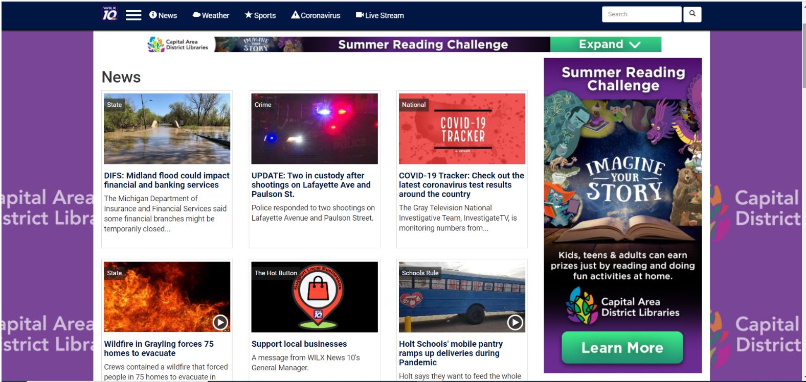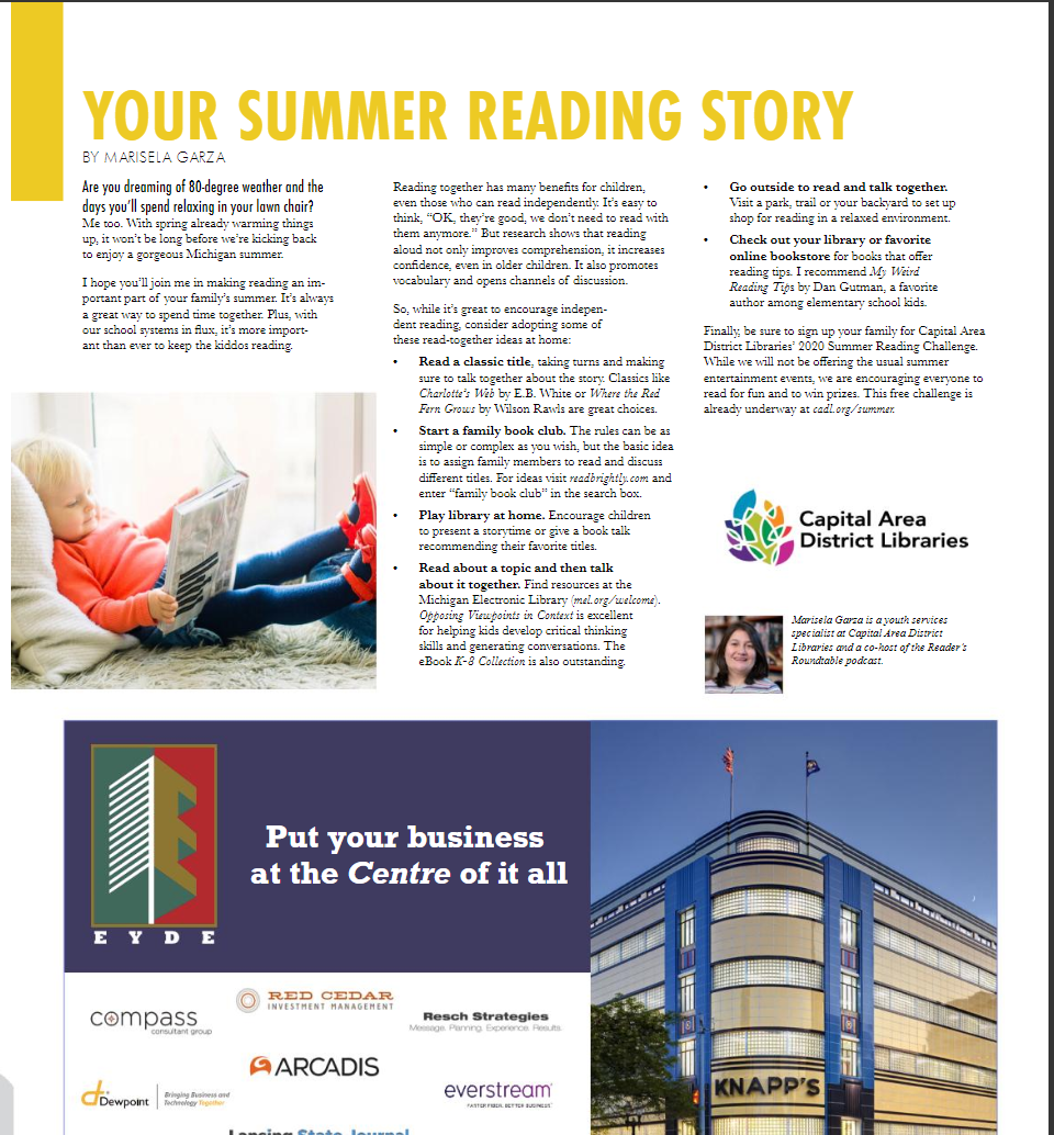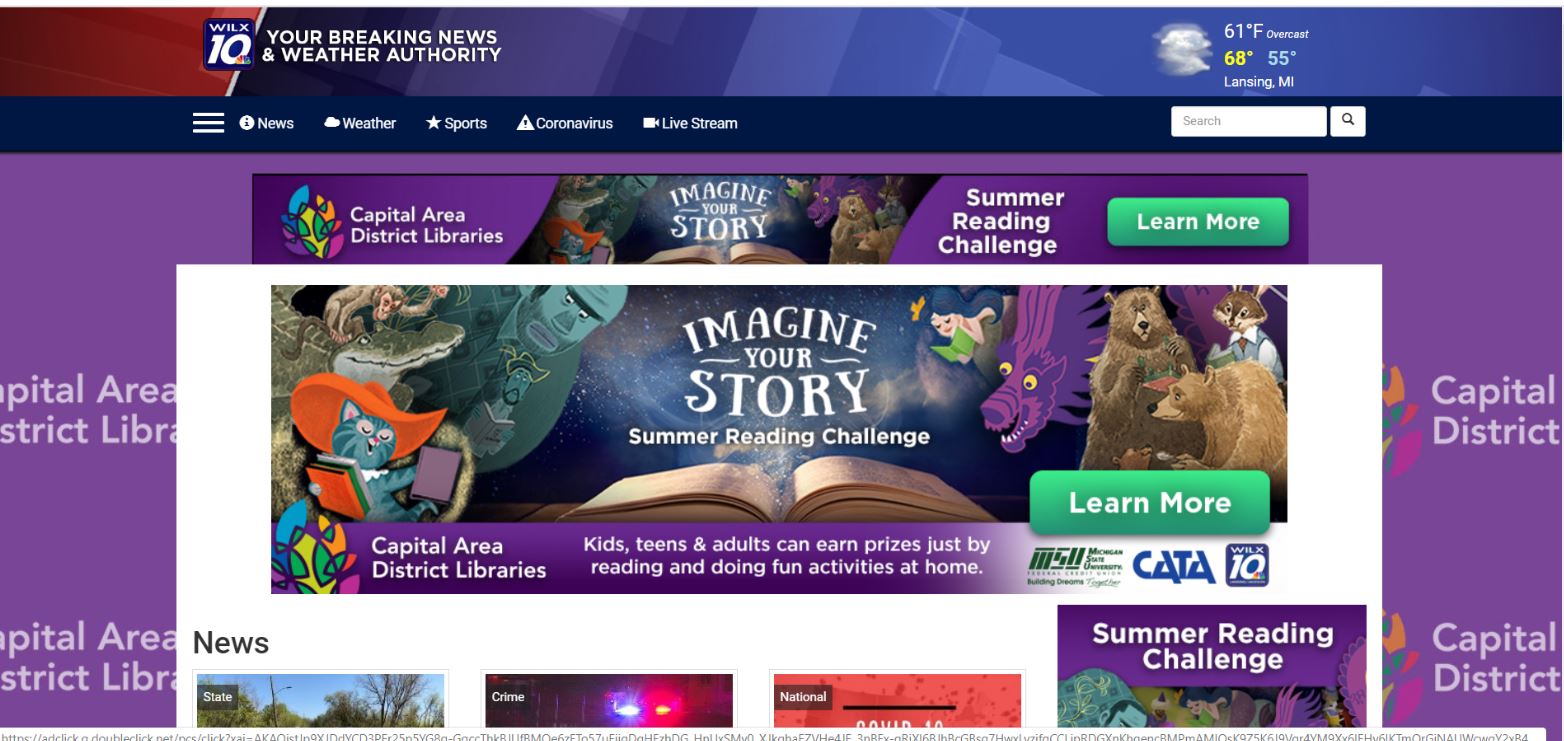 CADL has launched its online Summer Reading Challenge. The challenge is being promoted through media website takeovers (see attached examples), staff generated content and ads in digital publications (see attached examples). Promotion will also occur through Google Ads, Over the Top Television (OTT) campaign, Facebook ads, television and radio. Summer Reading Challenge Digital Guide: https://www.flipsnack.com/F8FAA95C5A8/an-online-adventure-for-kids-teens-adu... Summer Reading Challenge Landing Page: https://www.cadl.org/about/who-what-why/blog/imagine-your-story-summer-readi... Reader's Roundtable Podcast Summer Reading Episode https://audioboom.com/posts/7572357-reader-s-roundtable-episode-25-summer-re... Trenton M. Smiley Marketing & Communications Director Capital Area District Libraries-Administration 401 S. Capitol Ave., Lansing, MI 48933 517-367-6348 | smileyt@cadl.org<mailto:smileyt@cadl.org> www.cadl.org<https://urldefense.proofpoint.com/v2/url?u=http-3A__www.cadl.org&d=DQMFAg&c=euGZstcaTDllvimEN8b7jXrwqOf-v5A_CdpgnVfiiMM&r=eQ4zwfvICxqHRkdUL5_5Ew&m=10jJJ5KSdHz2-h8X5t1pHUHubNn2DWMq89Hf3-OPD2Y&s=3rbAsyBXjj2NNLBsgfvAFXBIOTtrw486OCi5yA3tUNc&e=> | facebook.com/cadlibrary<https://urldefense.proofpoint.com/v2/url?u=https-3A__www.facebook.com_cadlibrary-3Fref-3Dhl&d=DQMFAg&c=euGZstcaTDllvimEN8b7jXrwqOf-v5A_CdpgnVfiiMM&r=eQ4zwfvICxqHRkdUL5_5Ew&m=10jJJ5KSdHz2-h8X5t1pHUHubNn2DWMq89Hf3-OPD2Y&s=Mh_HT9zWTBaQYNJrkGn5UQkZsHahpNWPo3T1jUZsMTo&e=> | twitter.com/cadl<https://urldefense.proofpoint.com/v2/url?u=http-3A__www.twitter.com_cadl&d=DQMFAg&c=euGZstcaTDllvimEN8b7jXrwqOf-v5A_CdpgnVfiiMM&r=eQ4zwfvICxqHRkdUL5_5Ew&m=10jJJ5KSdHz2-h8X5t1pHUHubNn2DWMq89Hf3-OPD2Y&s=kjEu80TS31ymwngLwD5AH2BEd7u0lbjJEff7iRegUfQ&e=>