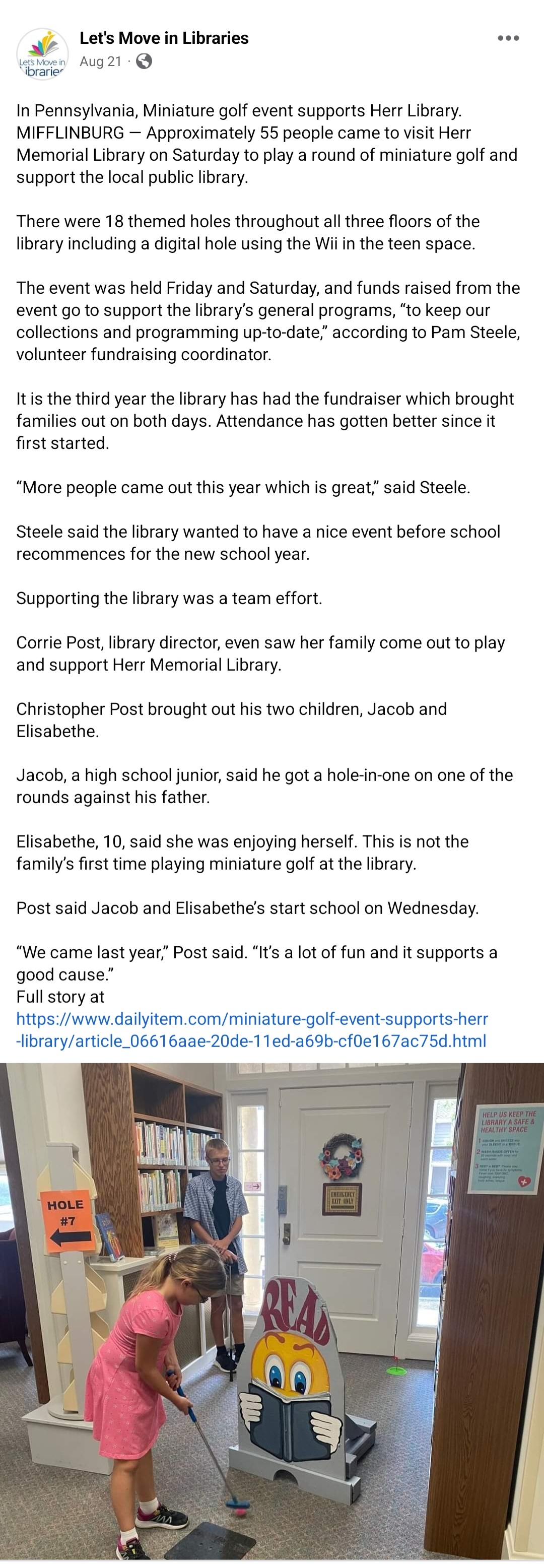 I recently saw the attached screenshot on Facebook about a library offering minigolf and thought it was a great idea as an event! On Fri, Sep 16, 2022, 12:44 PM Jo Angela Oehrli via Michlib-l < michlib-l@mcls.org> wrote:
