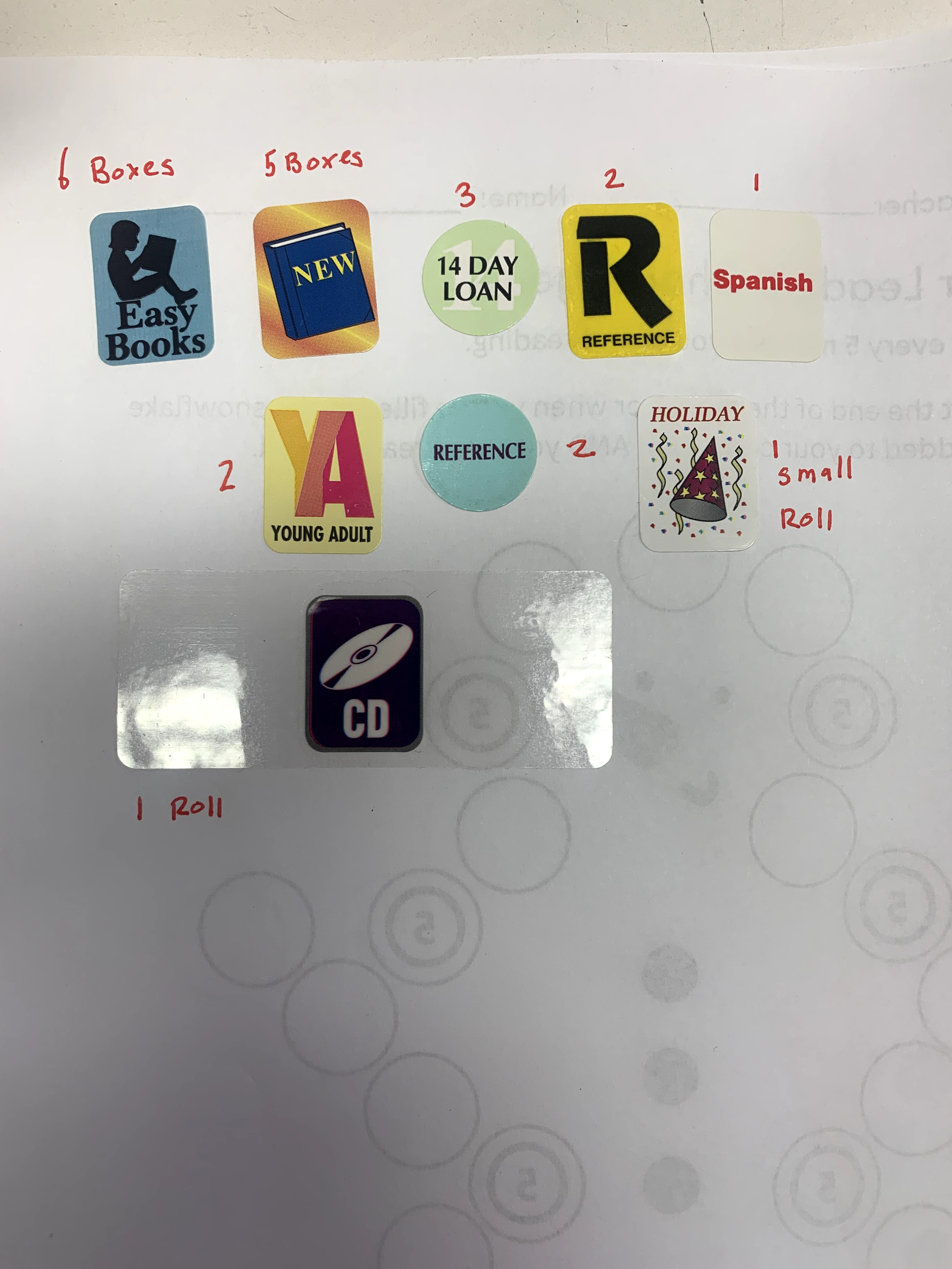 We currently have: 6 boxes of brodart "Easy Books" stickers (5 boxes are circa 1968 for you collectors out there!) 5 boxes of demco "New" stickers SKU:12803120 3 boxes of demco round "14 Day Loan" stickers SKU:12802540 2 boxes of brodart "Reference" stickers (circa 1968 and yes by some unknown force their adhesive is as strong as ever!) 1/2 box of demco "Spanish" stickers SKU:12852270 2 boxes of demco "Young Adult" stickers SKU:12800430 2 boxes of demco round "Reference" Stickers SKU:12802650 1 small roll of demco "Holiday" stickers (no box) 1 roll of demco all-in-one "CD" stickers (no box, sticker includes classification label and label protector)