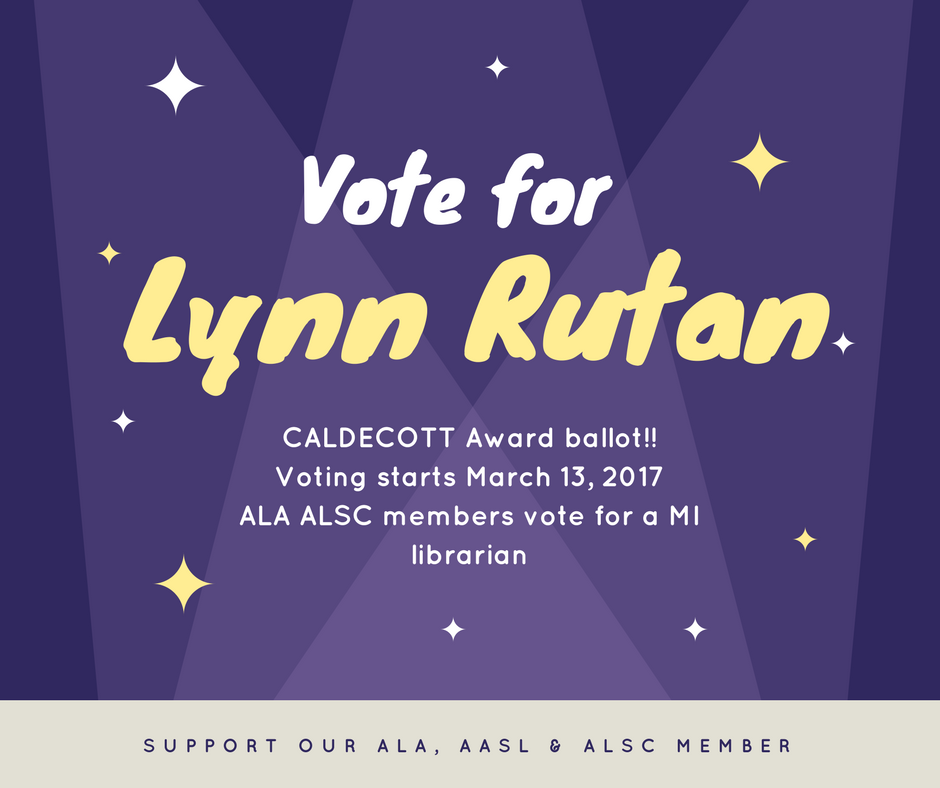 There is a MI Librarian running for a spot on the Caldecott committee. You may know Lynn from the Bookends blog http://www.booklistreader.com/category/bookends-childrens-literature/ [image: Inline image 1] Klaudia Janek, MLIS *School Librarian* *IB Extended Essay Coordinator* *Michigan Association for Media in Education - 2017 President-Elect & Conference Chair* *AASL Region #3 MI Delegate * 248 341 5925 http://iamediacenter.blogspot.com International Academy 1020 East Square Lake Road Bloomfield Hills, MI 48304 -- *International Academy* www.iatoday.org