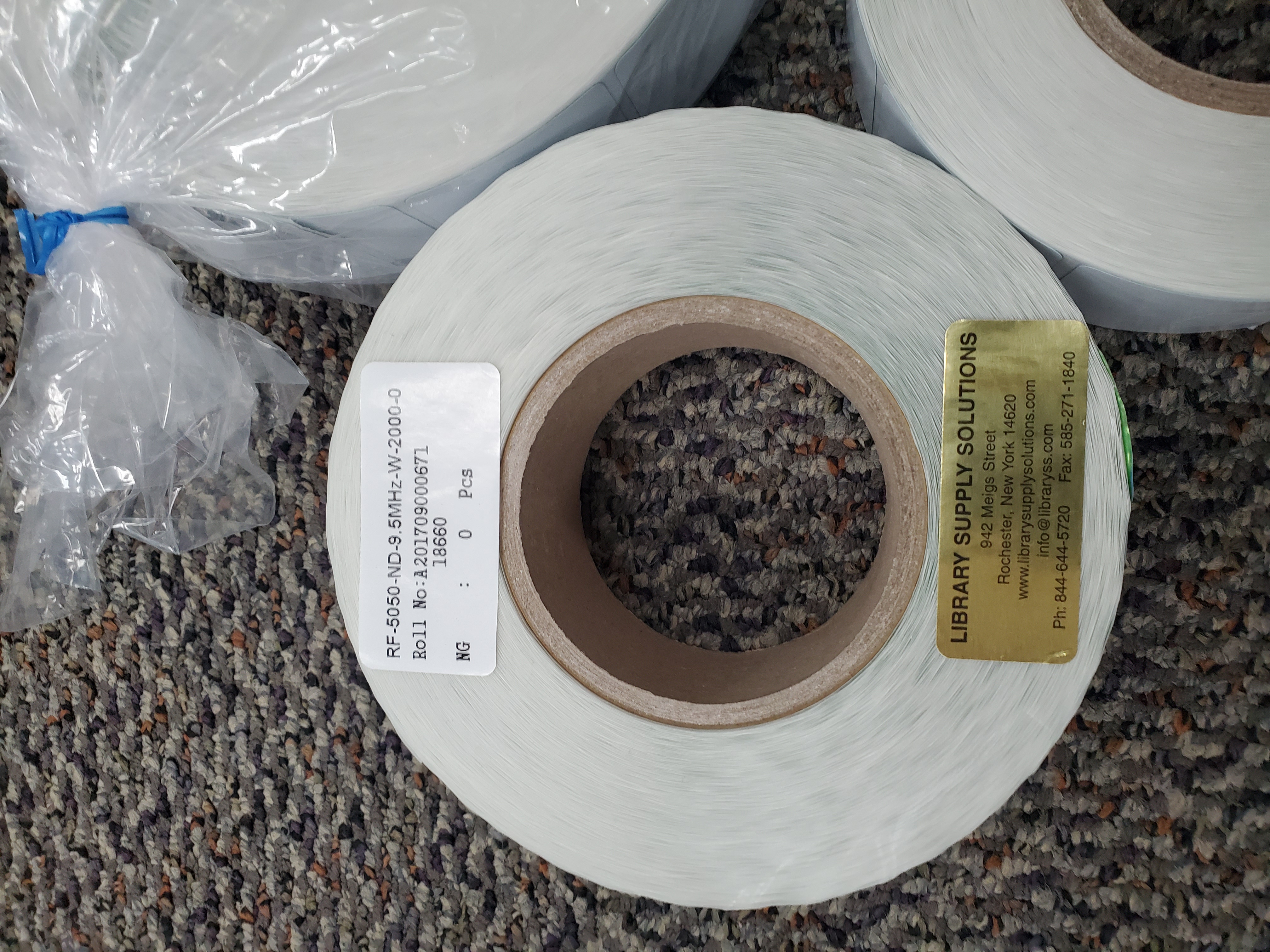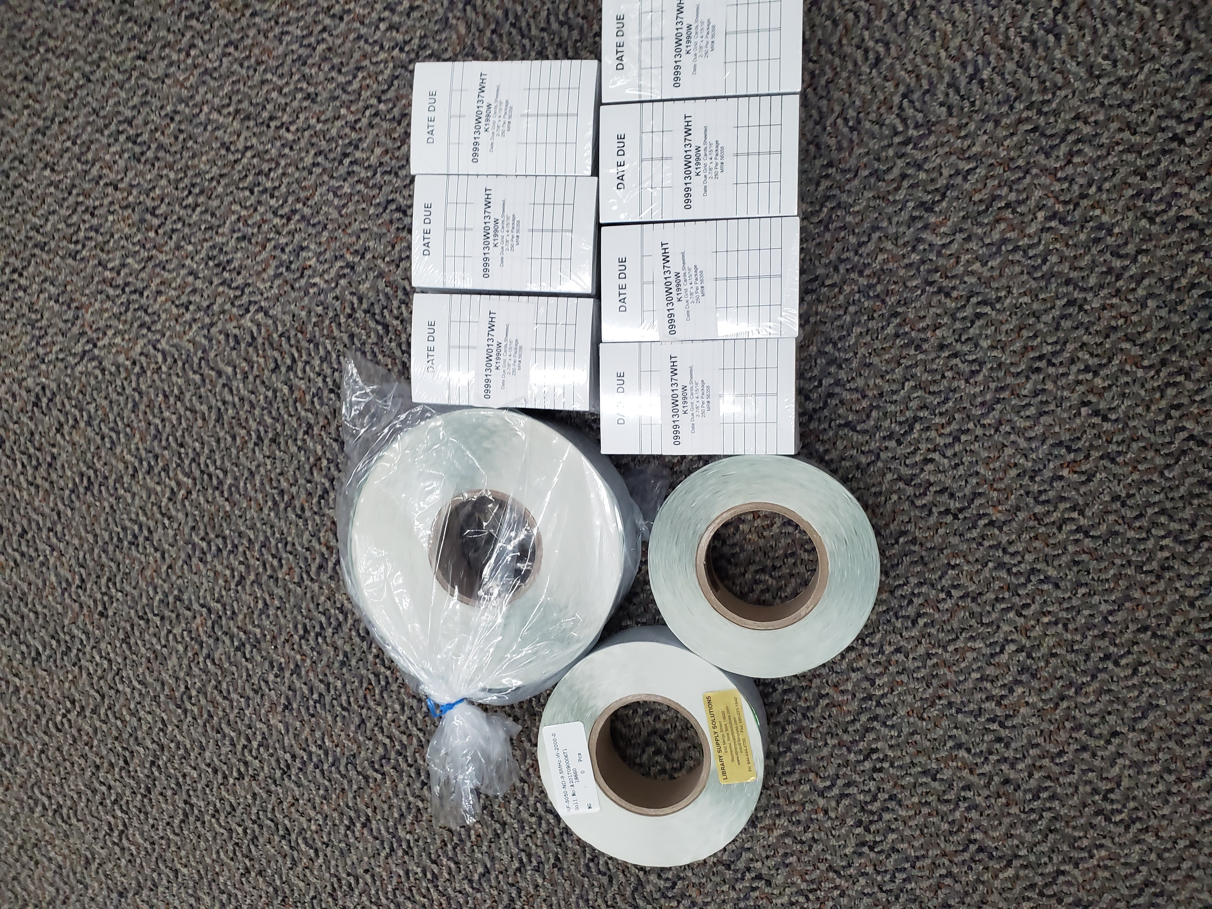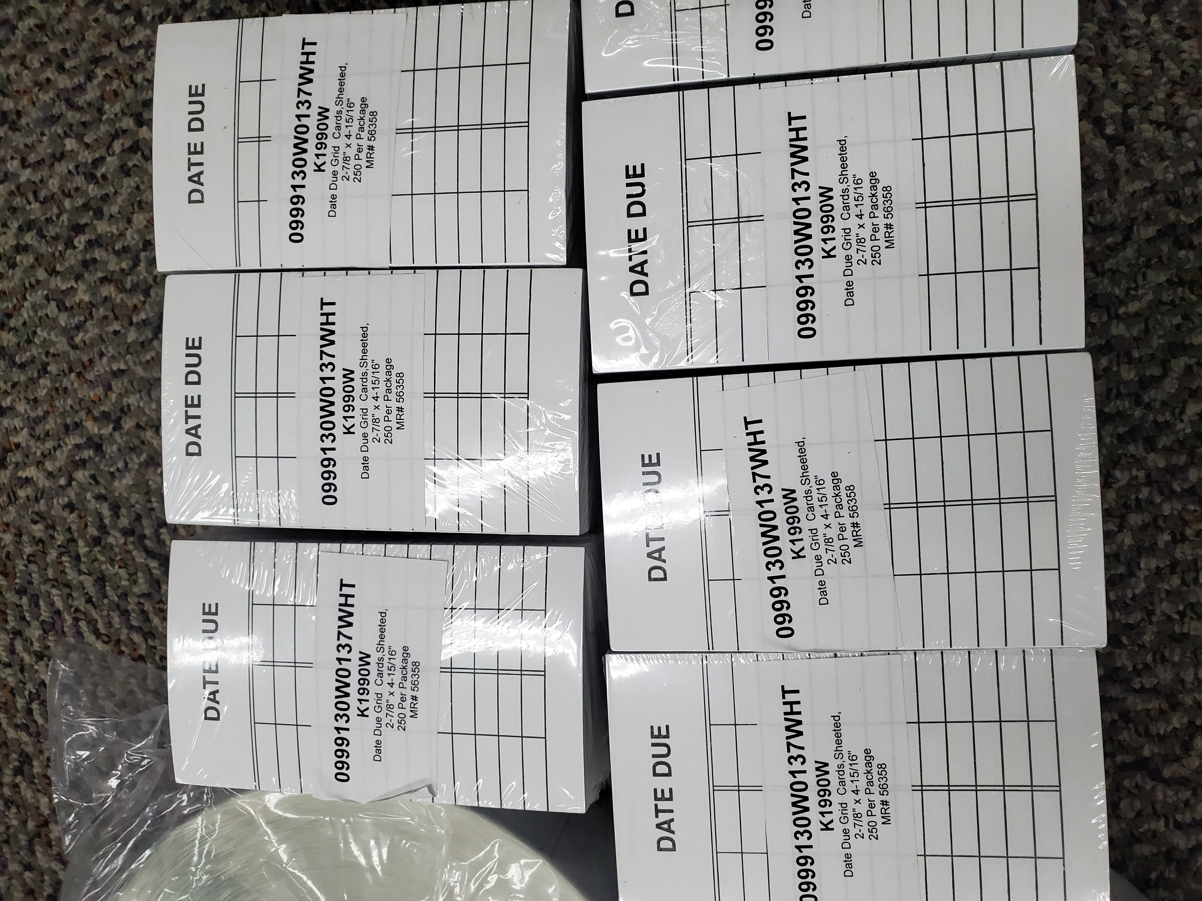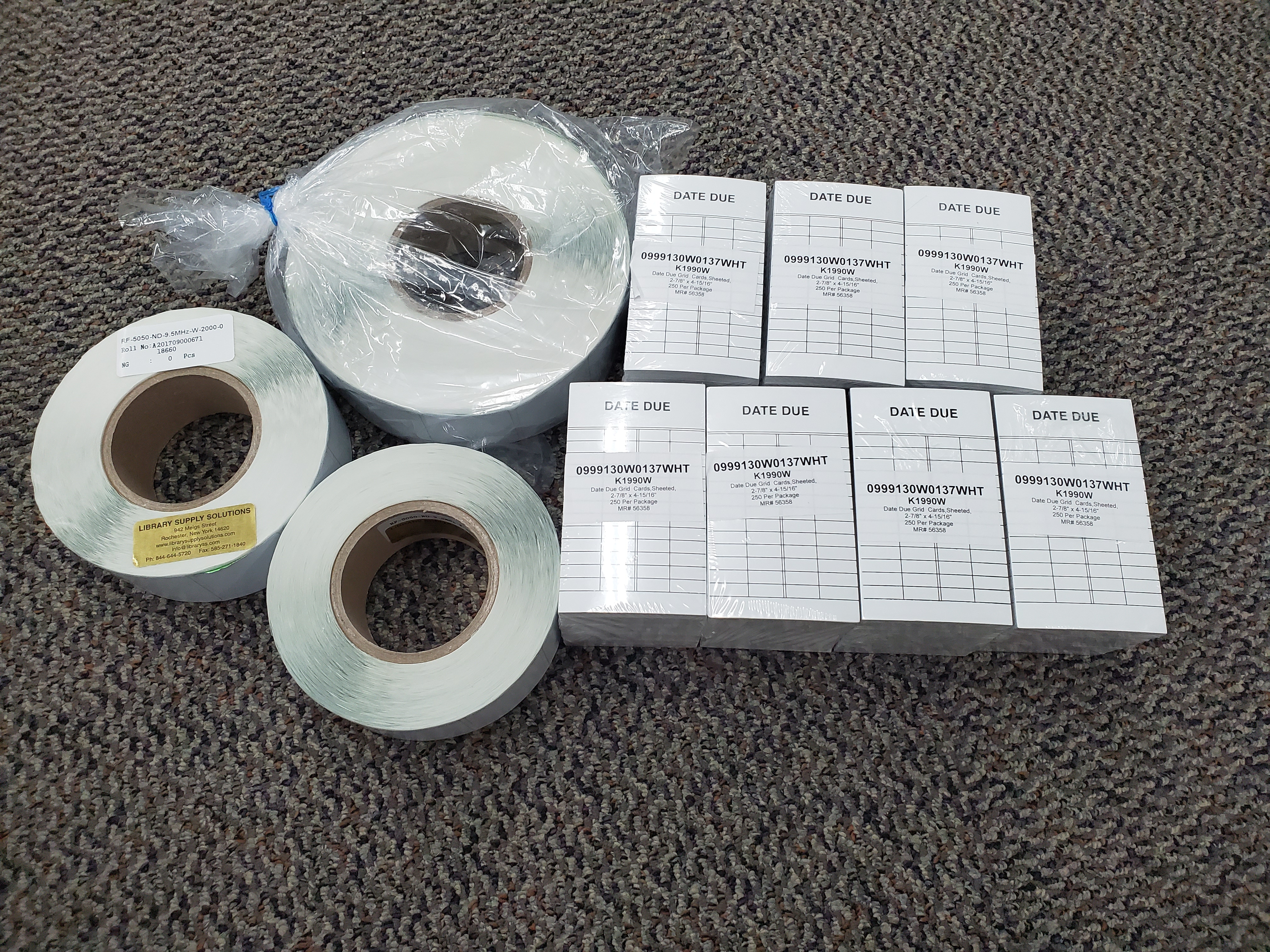 7 packages - Date Due RF Detuning cards, 250 per package 1 roll of 2000 security tags 5MHz 2 partial rolls = about 2000 security tags 5MHz Will go to 1st library to respond with Rides code Pictures attached.