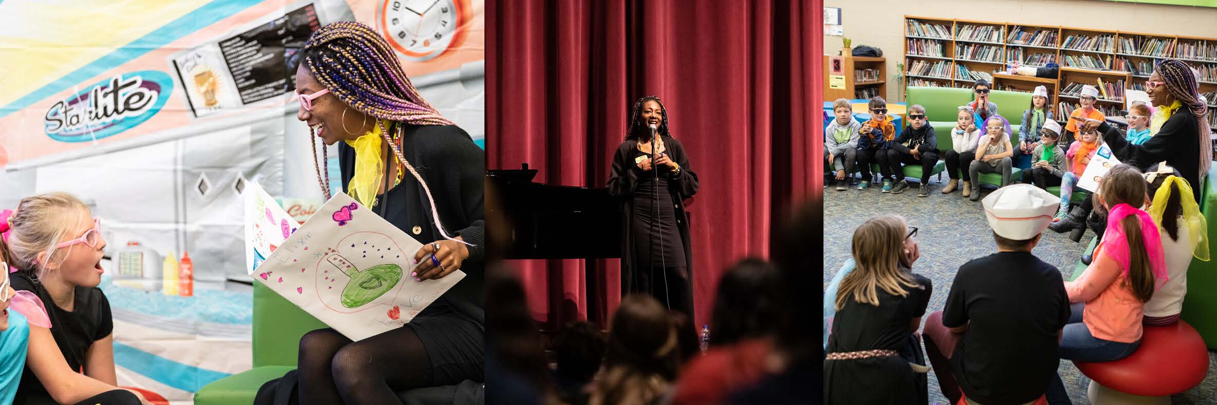 From the high school, Jones moved on to South Meadows Elementary School, where she engaged Sarah Radomski’s 4th grade classroom in a scaled-down version of Opera on Tap’s Playground Operas program. CDL Youth & Teen Librarian Jessica Zubik and Director Lori Coryell worked with students in