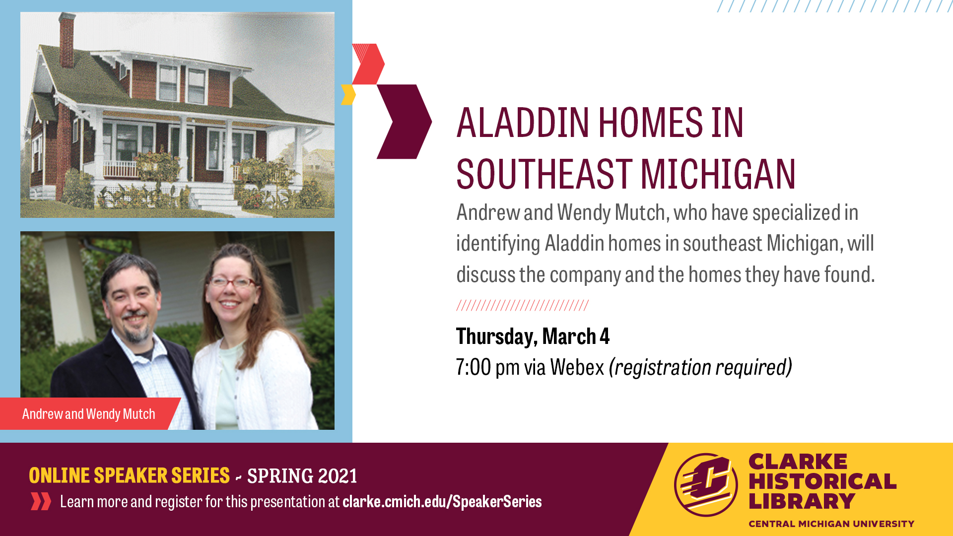 On Thursday, March 4, at 7:00 pm, the Clarke Historical Library will host Wendy and Andrew Mutch to speak about the Aladdin Kit Home Company. The Clarke is the home of the Aladdin Company archives, with over 350 cubic feet of company records including plans and blueprints, product catalogs, individual sale receipts, and much more. Wendy and Andrew are Aladdin Kit Home aficionados who have researched the company and have identified Aladdin homes throughout southeastern Michigan and beyond. This presentation is free and open to the public. The event will be broadcast via Central Michigan University's videoconferencing tool, Webex, and it will be recorded to enjoy at a later time. Registration is required for the event and the shortened link to register is: https://is.gd/AladdinHomes Feel free to share this information far and wide! The Clarke is happy to answer any questions that anyone may have-please contact Bryan Whitledge (whitl1br@cmich.edu<mailto:whitl1br@cmich.edu>). Have a great day, Bryan Whitledge Archivist for University Digital Records Clarke Historical Library Central Michigan University 989-774-2159 whitl1br@cmich.edu<mailto:whitl1br@cmich.edu>