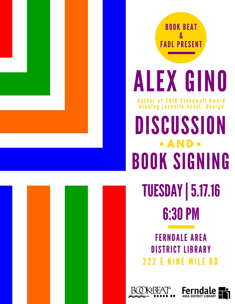 Hello all, Ferndale is pleased to share the following program with everyone! Tuesday, May 17, award winning author Alex Gino will be at Ferndale Library to talk about their middle grade novel *George*, with a question and answer session and book signing to follow. Copies of *George* will be available for purchase through BookBeat, who is co-sponsoring the event. No registration is required. Gino is the winner of the American Library Association's 2016 Stonewall Book Award for *George*, and an active member of the online campaign We Need Diverse Books: weneeddiversebooks.org/ -- Ashley Lehman Head of Youth Services Ferndale Area District Library 222 E. Nine Mile Ferndale, MI 48220 248-546-2504 ext.699 Ashley@ferndalepubliclibrary.org