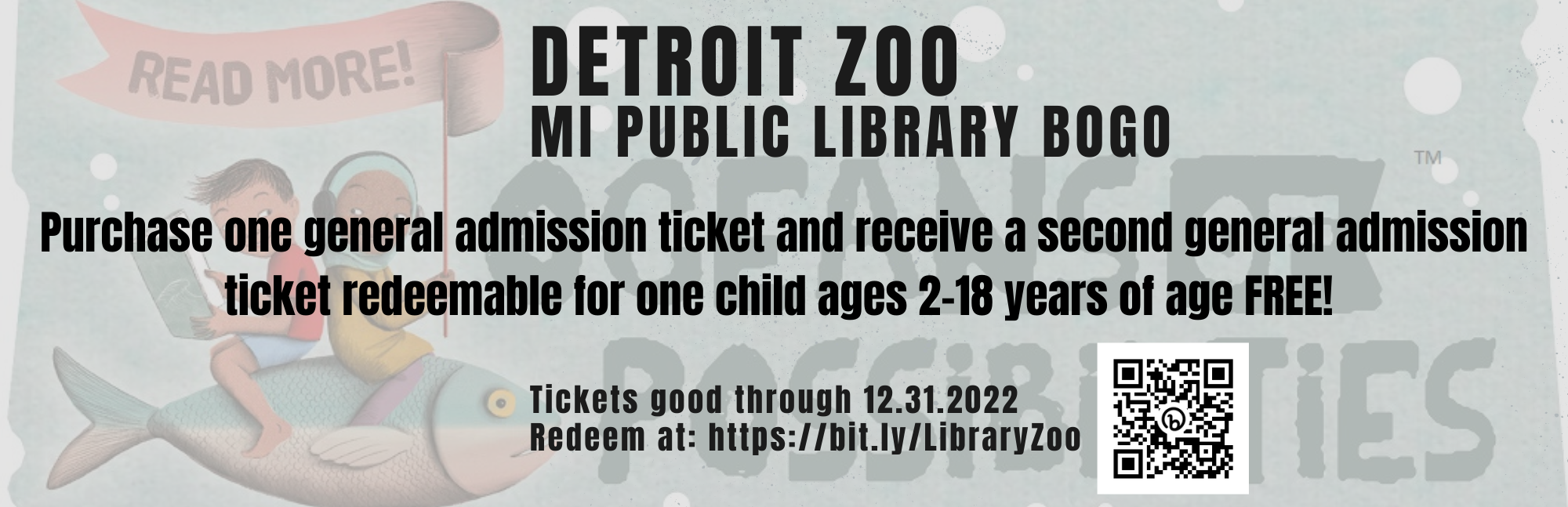 The Library of Michigan is excited to announce, in collaboration with the Detroit Zoo, a summer reading prize opportunity for your clubs! The Detroit Zoo is providing your summer library participants a special MI Library BOGO<https://tickets.detroitzoo.org/affiliate?vid=0&vs=1>: Purchase one general admission ticket and receive a second general admission ticket redeemable for one child ages 2-18 years of age FREE! The Zoo is also providing the adult ticket at a discount price and a parking voucher. Patrons can redeem their bogo at https://bit.ly/LibraryZoo. I've also created a "coupon" for you to print & award to your program participants, and a QR code, all of which you can find here: https://drive.google.com/drive/folders/1Nyy1skmSaHYrKNHI5J0cbPcEgCaivvdt?usp.... Please use the Detroit Zoo's Michigan Library Bogo as an incentive for participation in your summer programs. This is not for general shares to the public (nor for non-library participants). This offer is good through December 31, 2022, so families that live far away have the opportunity to plan and travel, should they choose to! A big THANK YOU to the Detroit Zoo for providing this opportunity for our families to continue to explore #OceansOfPossibilities and for encouraging reading this summer. [cid:image001.png@01D875A0.671A1790] Cathy Lancaster Youth Services Coordinator Library of Michigan 702 W. Kalamazoo St. Lansing, MI 48915 My Pronouns: She/Her/Hers - See www.mypronouns.org<http://www.mypronouns.org/> to learn more. LancasterC5@michigan.gov<mailto:LancasterC5@michigan.gov> | 517-335-8129 | www.mi.gov/libraryofmichigan<http://www.mi.gov/libraryofmichigan> Follow us: Facebook<https://www.facebook.com/libraryofmichigan/> | Twitter<https://twitter.com/libraryofmich> | Instagram<https://www.instagram.com/libraryofmichigan/> Join the MiYouth<https://gcc01.safelinks.protection.outlook.com/?url=http%3A%2F%2Fmail2.mcls.org%2Fmailman%2Flistinfo%2Fmiyouth&data=02%7C01%7CNorrisS2%40michigan.gov%7Caf51448f1e92415533aa08d6f4b53328%7Cd5fb7087377742ad966a892ef47225d1%7C0%7C0%7C636965456410852648&sdata=nModcBWFyzGoDGK%2FtwsSeAXV%2F85AQKEtzzQQj%2FV%2B5fM%3D&reserved=0> Listserv, created for Michigan public library staff to share and discuss children and teen programming and services.