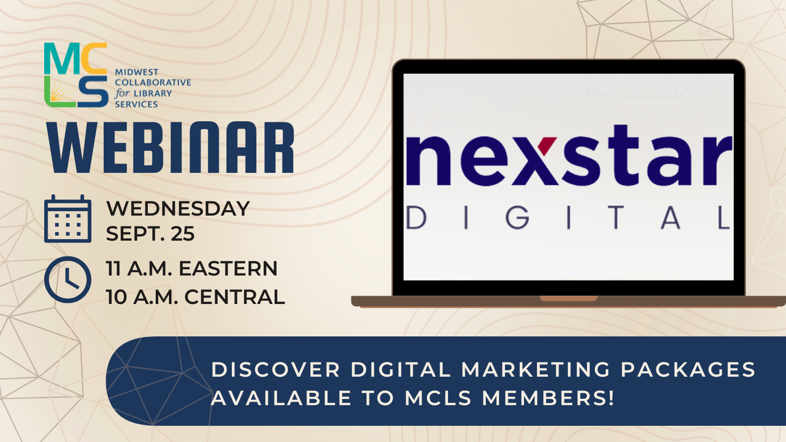 MCLS Members: Market your public library with Nexstar Digital Register now for the webinar<https://us02web.zoom.us/meeting/register/tZ0oc-ivpzgiH9e6tLVk_yG7gQ3znE1CLpzz#/registration> - Sept. 25 at 11 a.m. Eastern (10 a.m. Central) Public libraries have always been a centerpiece of our communities. With the evolution of technology and media consumption habits, libraries have adapted to these trends by offering a wide variety of products and community events. However, with these innovations comes a gap in community awareness of new services. To empower libaries to fill this gap, MCLS is partnering with Nexstar Digital, a leading diversified media company that produces and distributes engaging local and national news, sports, and entertainment content across its television and digital platforms. Nexstar owns America’s largest local broadcasting group comprised of top network affiliates, with 200 owned or partner stations in 116 U.S. markets reaching 220 million people. Nexstar Digital’s proprietary advertising technologies empower advertisers to create personalized omnichannel marketing programs that target custom audiences and improve consumer experiences across all platforms. Nexstar Digital is comprised of the Nexstar Network, The CW, The Hill, NewsNation, and BestReviews. Through this partnership, public library members can reach a broad range of their community to share news and information about the value and importance of their local public library. Public libraries have always been a community centerpiece but changes that have come with technology have impacted public awareness of this fact. One goal of this opportunity is to bridge the gap of community awareness about the library as a valuable community hub and all the rich resources it has to offer. A webinar outlining how libraries of any size in both IN and MI can participate in this awareness and outreach offer is scheduled for Wednesday, Sept. 25 at 11 a.m. Eastern (10 a.m. Central). Register now<https://us02web.zoom.us/meeting/register/tZ0oc-ivpzgiH9e6tLVk_yG7gQ3znE1CLpzz> to receive a confirmation email containing information about joining the Zoom meeting. For a quote or more information, please contact our team at services@mcls.org<mailto:services@mcls.org> or 517-939-1382. Mary Ruthko (she/her) Marketing and Communication Coordinator Midwest Collaborative for Library Services 517-507-4149 ruthkom@mcls.org<mailto:ruthkom@mcls.org> [cid:679c84df-f8f1-4ac3-9675-10275f1245be] mcls.org<https://www.mcls.org/> | Facebook<https://www.facebook.com/mcls.org> | X<https://twitter.com/mclsorg> | LinkedIn<https://www.linkedin.com/company/midwest-collaborative-for-library-services> Schedule a meeting with me<https://outlook.office.com/bookwithme/user/82504839b07649009896aaa10a3d2395@mcls.org?anonymous&ep=signature>