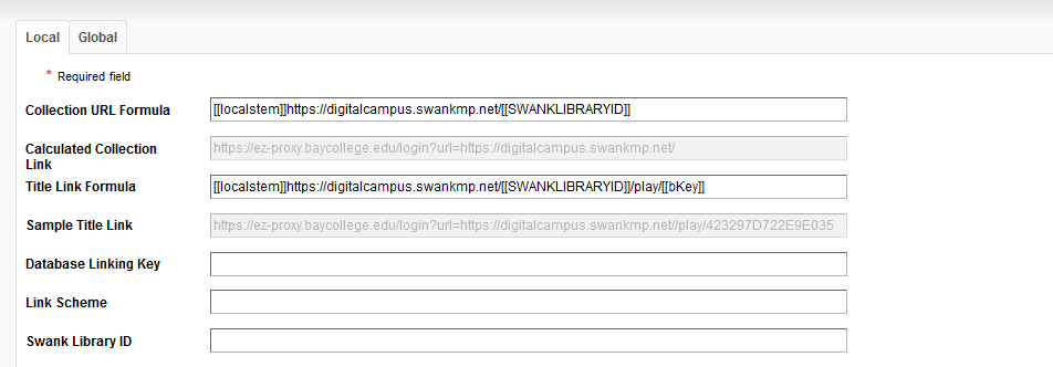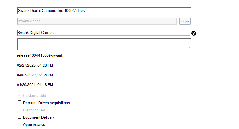 Tapping in to the wisdom of the library world 😊 We have a very small collection of streaming SWANK films (8), I have tried to enable the Knowledge Base Collection, selected only the titles we leased. But the view now link in the catalog does not resolve to the streaming film. (It goes to SWANK generic view catalog page). The below are some screen shots for those who use system (KB) I am hopina a techie out there can point out probably a simple setting that is wrong to get the films to stream. Thanks in advance! Ann Properties tab [cid:960c63ba-bf32-4050-bf92-4c131c449e50] This is from the collection linking tab [cid:dd6e06cd-4e46-4069-9e6d-dcda6efeeafa] Holdings & MARC Records tab [cid:4d0ffda7-c3f0-411e-aa79-970462ffdd4b] Not sure where else settings may need to be tweaked. And I have waited over 10 days for OCLC to come up with an answer. I did get someone from support to respond initially, then the ticket was pushed over to th KB support team and I have not heard from them for 10 days! Thanks from a frustrated not so technical librarian Ann ******************************************************************** Ann Bissell Reference Librarian Bay College Library 906-217-4079 800-221-2001 Fax 906-217-1682 Bay de Noc Community College 2001 North Lincoln Road Escanaba, MI 49829 bissella@baycollege.edu<mailto:bissella@baycollege.edu>