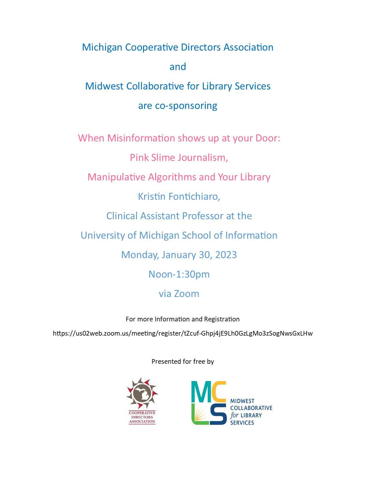 Hi Everyone Please join MCDA and MCLS who are co-sponsoring Kristin Fontichiaro, Clinical Assistant Professor at the UM School of Information session: When Misinformation shows up at your Door: Pink Slime Journalism, Manipulative Algorithms and Your Library Monday, January 30, 2023 Noon till 1:30pm Via Zoom For more Information and Registration https://us02web.zoom.us/meeting/register/tZcuf-Ghpj4jE9Lh0GzLgMo3zSogNwsGxLH... [image: Misinformation STD 1_30_23 2.jpg]