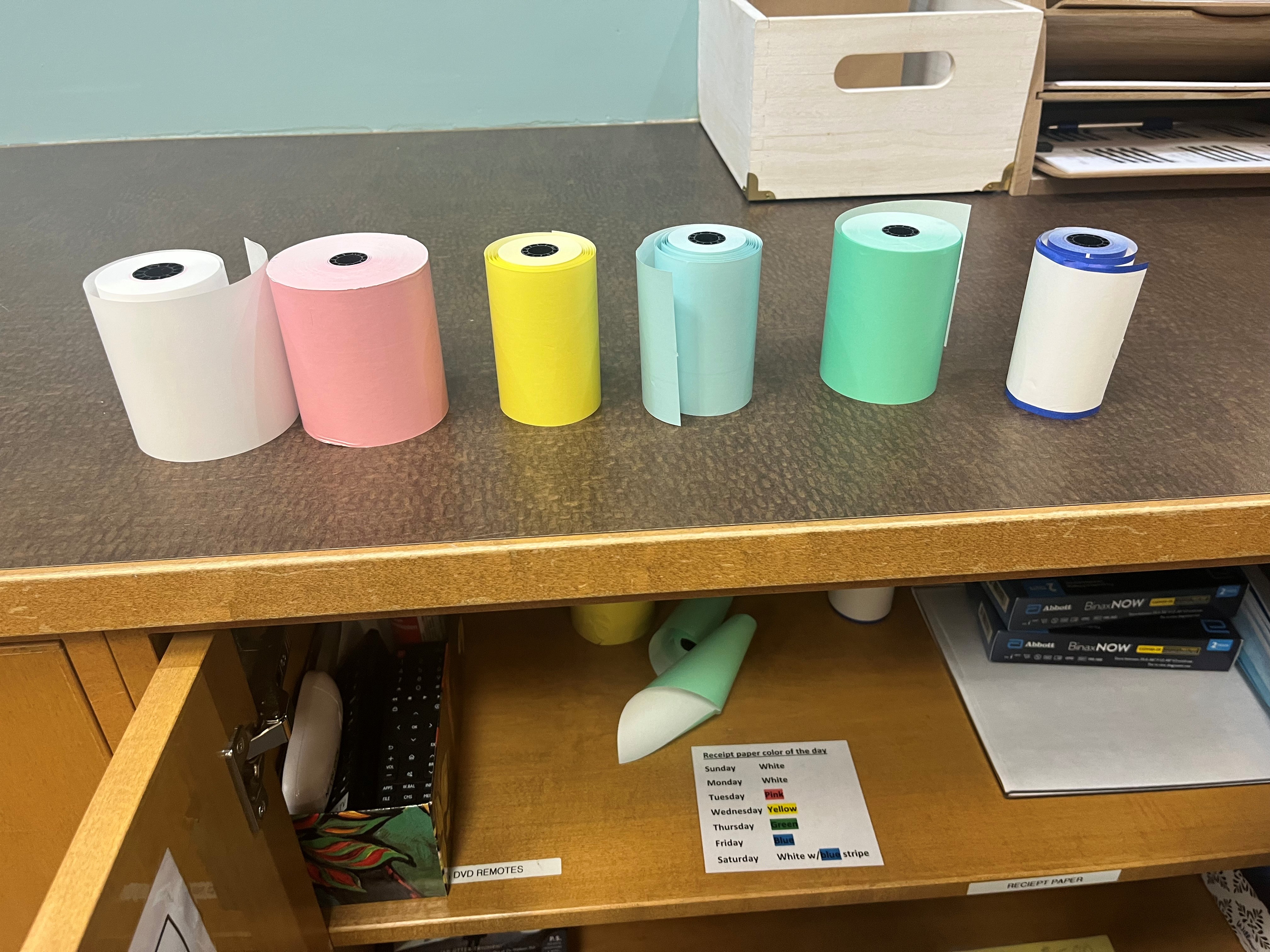 Hello All, We have the following boxes (50 rolls in each box) of 3 1/8" x 230" thermal register tape looking for a new home. Let me know if you would like a box and I'll send it through TLN delivery. These are not PBA free. White - 2 boxes Green stripe - 2 boxes Green - 1 and ¼ boxes Yellow - 1 box Pink - 1 box Blue - 2 boxes Blue stripe - 2 boxes Thanks, Joyce [cid:image001.png@01DBF0B3.A1640320] Joyce Becker Administrative Assistant Orion Township Public Library 825 Joslyn Road, Lake Orion, MI 48362 Phone: (248) 693-3000 ext. 431 | Direct: (248) 287-8020 orionlibrary.org