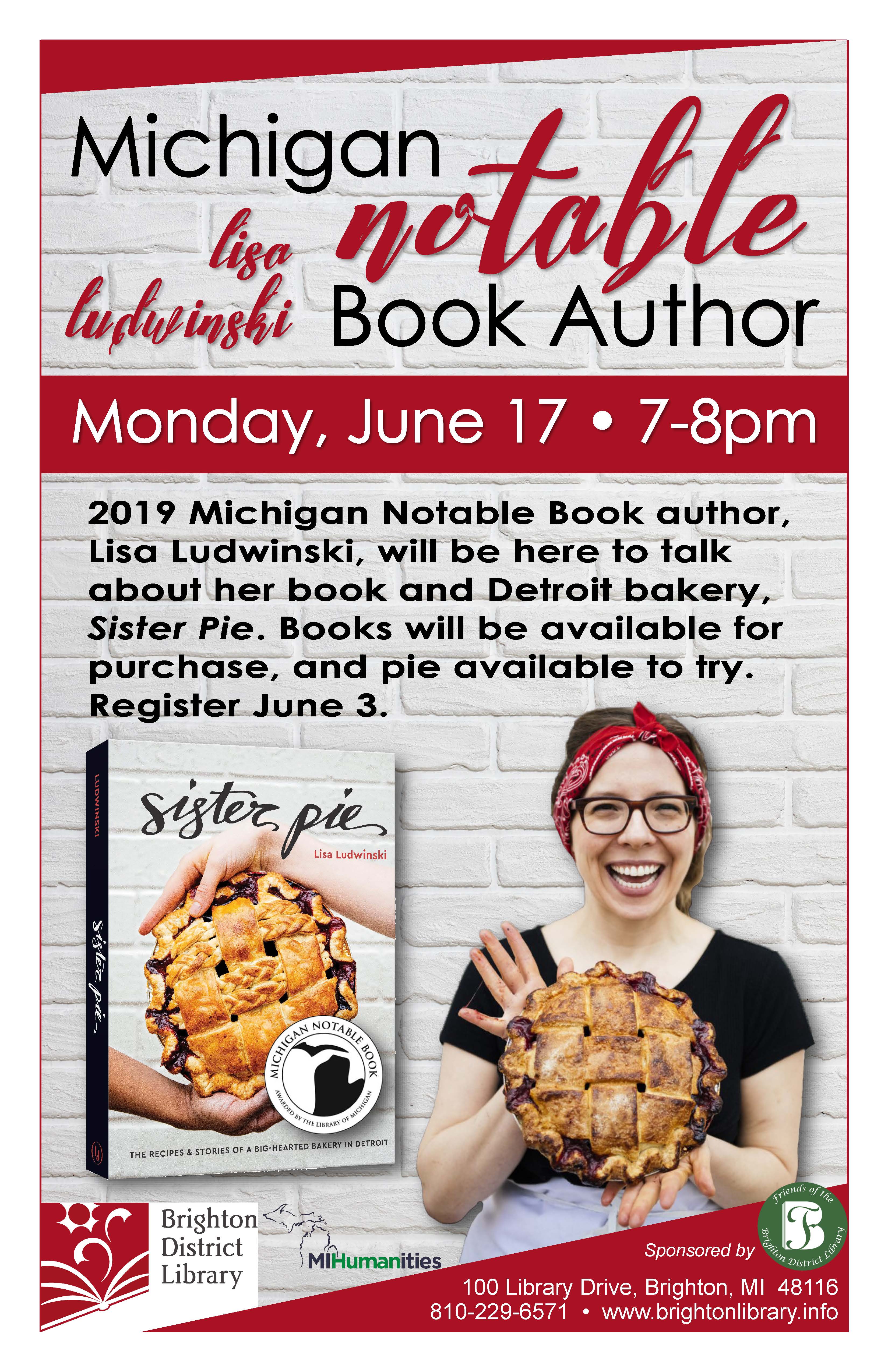 Hi everyone, The Brighton District Library is pleased to host author Lisa Ludwinski, owner of Sister Pie bakery in Detroit, as part of the Michigan Notable Author Tour. Lisa will be here from 7-8pm on Monday, June 17. Registration for this event begins Monday, June 3. <http://brightonlibrary.evanced.info/signup/EventDetails?EventId=4800&backTo=Calendar&startDate=2019/06/01> [image: Sister Pie 6.17.jpg] <http://brightonlibrary.info/wp-content/uploads/2019/06/Sister-Pie-6.17.pdf> Jennifer Osborne Head of Adult Services Brighton District Library 810-229-6571 x225 josborne@brightonlibrary.info